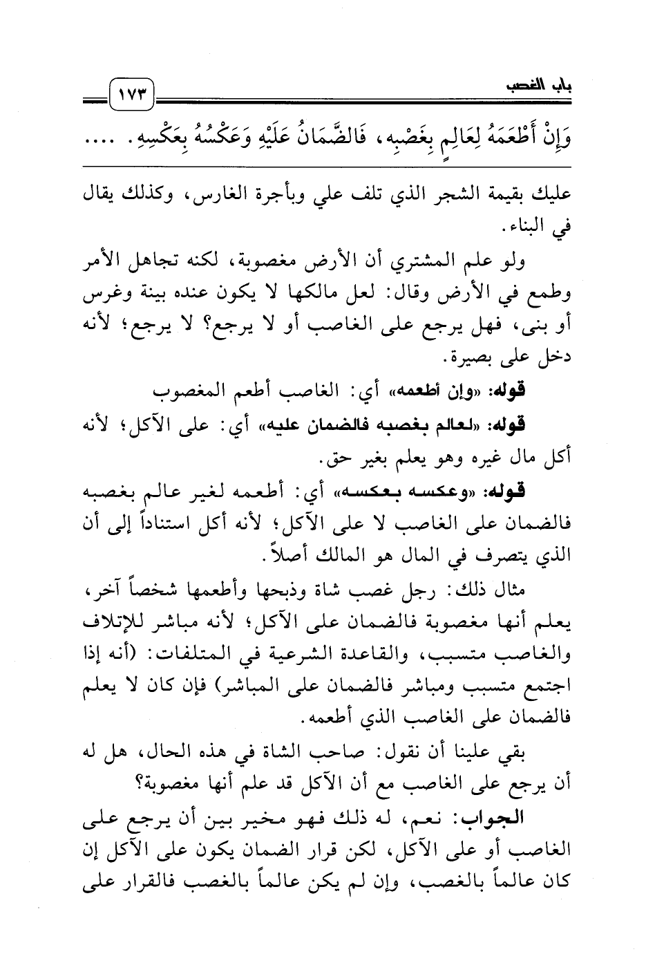 قوله: «وعكسه بعكسه» أي: أطعمه لغير عالم بغصبه فالضمان على الغاصب لا على الآكل؛ لأنه أكل استناداً إلى أن الذي يتصرف في المال هو المالك أصلاً.