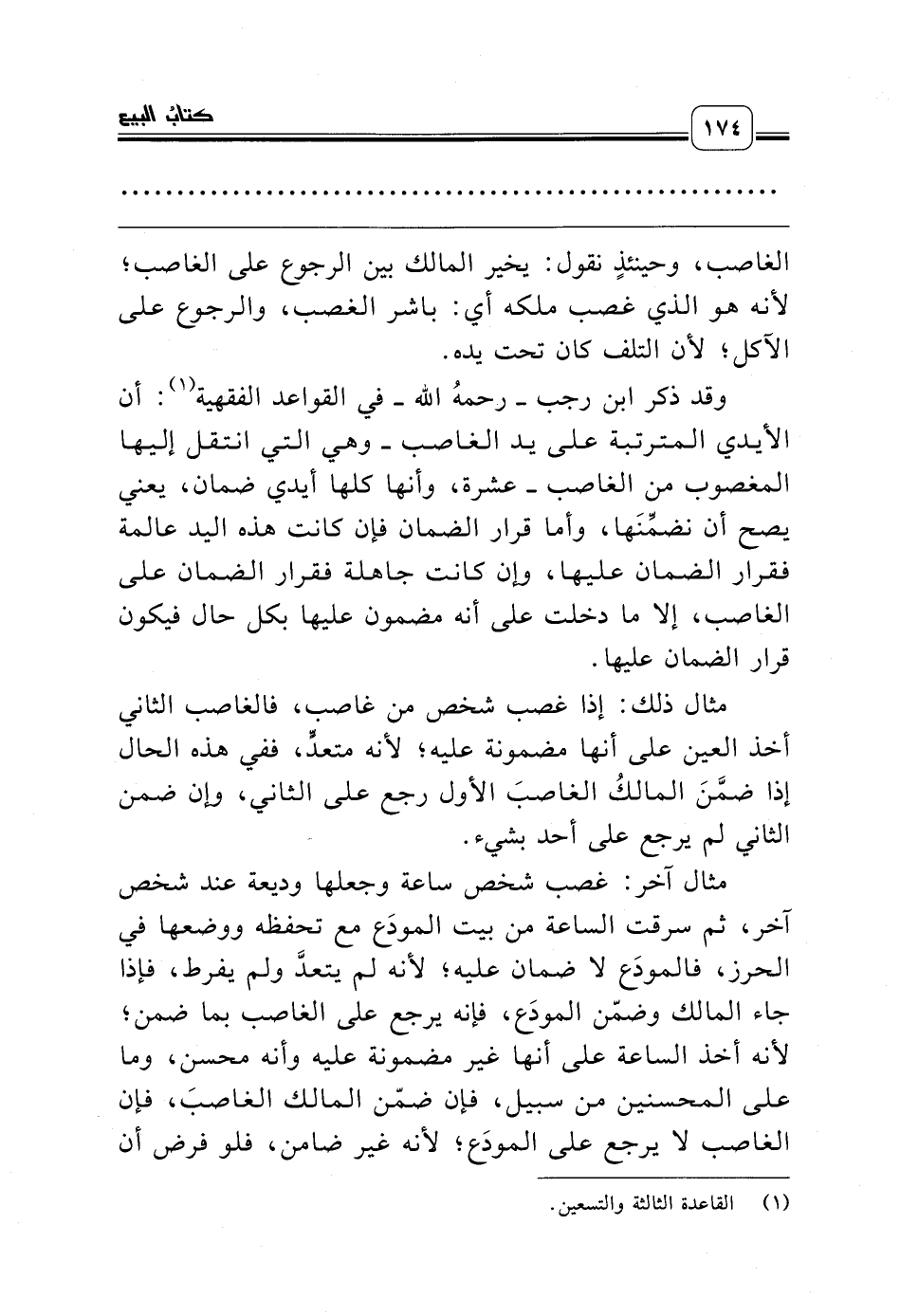 وقد ذكر ابن رجب ـ رحمه الله ـ في القواعد الفقهية (¬1): أن الأيدي المترتبة على يد الغاصب ـ وهي التي انتقل إليها المغصوب من الغاصب ـ عشرة، وأنها كلها أيدي ضمان، يعني يصح أن نضمِّنَها، وأما قرار الضمان فإن كانت هذه اليد عالمة فقرار الضمان عليها، وإن كانت جاهلة فقرار الضمان على الغاصب، إلا ما دخلت على أنه مضمون عليها بكل حال فيكون قرار الضمان عليها.