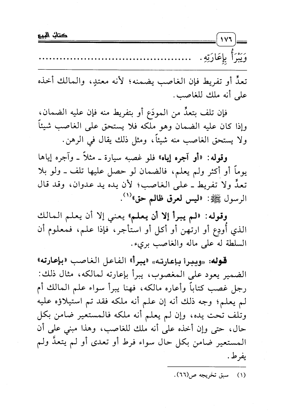 قوله: «ويبرأ بإعارته» «يبرأ» الفاعل الغاصب «بإعارته» الضمير يعود على المغصوب، يبرأ بإعارته لمالكه، مثال ذلك: رجل غصب كتاباً وأعاره مالكه، فهنا يبرأ سواء علم المالك أم لم يعلم؛ وجه ذلك أنه إن علم أنه ملكه فقد تم استيلاؤه عليه وتلف تحت يده، وإن لم يعلم أنه ملكه فالمستعير ضامن بكل حال، حتى وإن أخذه على أنه ملك للغاصب، وهذا مبني على أن المستعير ضامن بكل حال سواء فرط أو تعدى أو لم يتعدَّ ولم يفرط.