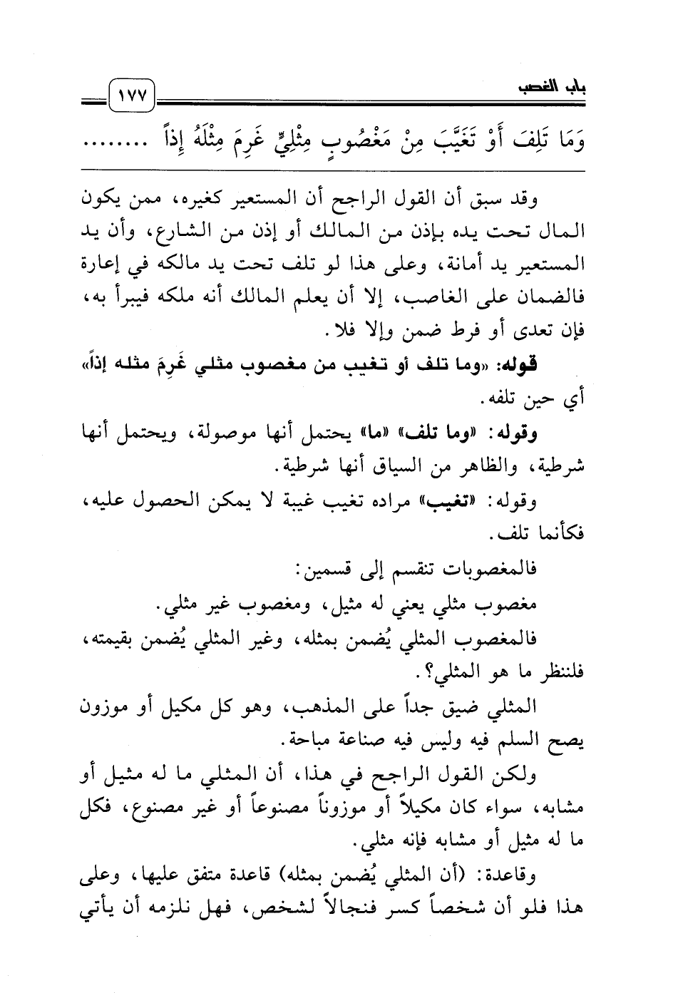وَمَا تَلِفَ أَوْ تَغَيَّبَ مِنْ مَغْصُوبٍ مِثْلِيٍّ غَرِمَ مِثْلَهُ إِذاً وَإِلاَّ فَقِيمَتُهُ يَوْمَ تَعَذَّرَ، وَيُضْمَنُ غَيْرُ المِثْلِيِّ بِقِيمَتِهِ يَوْمَ تَلَفِهِ، وَإِنْ تَخَمَّرَ عَصِيرٌ فَالمِثْلُ. فَإِنِ انْقَلَبَ خَلاًّ دَفَعَهُ وَمَعَهُ نَقْصُ قِيمَتِهِ عَصِيراً ......
