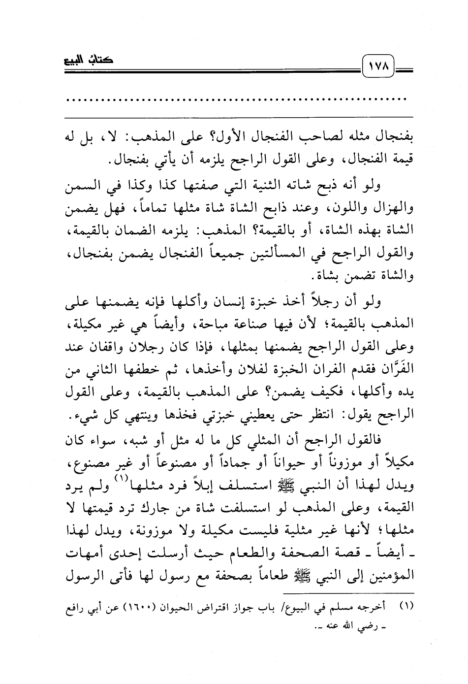 فالقول الراجح أن المثلي كل ما له مثل أو شبه، سواء كان مكيلاً أو موزوناً أو حيواناً أو جماداً أو مصنوعاً أو غير مصنوع، ويدل لهذا أن النبي صلّى الله عليه وسلّم استسلف إبلاً فرد مثلها (¬1) ولم يرد القيمة، وعلى المذهب لو استسلفت شاة من جارك ترد قيمتها لا مثلها؛ لأنها غير مثلية فليست مكيلة ولا موزونة، ويدل لهذا ـ أيضاً ـ قصة الصحفة والطعام حيث أرسلت إحدى أمهات المؤمنين إلى النبي صلّى الله عليه وسلّم طعاماً بصحفة مع رسول لها فأتى الرسول