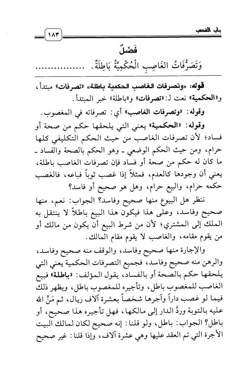 قوله: «وتصرفات الغاصب الحكمية باطلة» «تصرفات» مبتدأ، و «الحكمية» نعت لـ: «تصرفات» و «باطلة» خبر المبتدأ.