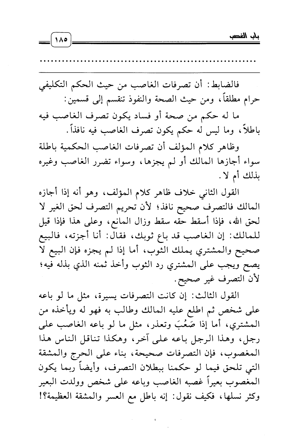 القول الثالث: إن كانت التصرفات يسيرة، مثل ما لو باعه على شخص ثم اطلع عليه المالك وطالب به فهو له ويأخذه من المشتري، أما إذا صَعُبَ وتعذر، مثل ما لو باعه الغاصب على رجل، وهذا الرجل باعه على آخر، وهكذا تناقل الناس هذا المغصوب، فإن التصرفات صحيحة، بناء على الحرج والمشقة التي تلحق فيما لو حكمنا ببطلان التصرف، وأيضاً ربما يكون المغصوب بعيراً غصبه الغاصب وباعه على شخص وولدت البعير وكثر نسلها، فكيف نقول: إنه باطل مع العسر والمشقة العظيمة؟!