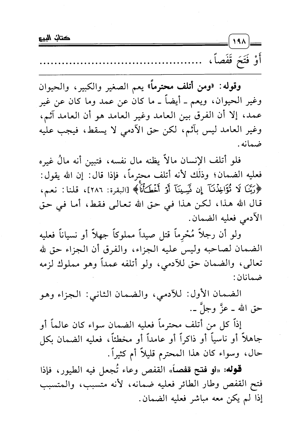 وقوله: «ومن أتلف محترماً» يعم الصغير والكبير، والحيوان وغير الحيوان، ويعم ـ أيضاً ـ ما كان عن عمد وما كان عن غير عمد، إلا أن الفرق بين العامد وغير العامد هو أن العامد آثم، وغير العامد ليس بآثم، لكن حق الآدمي لا يسقط، فيجب عليه ضمانه.