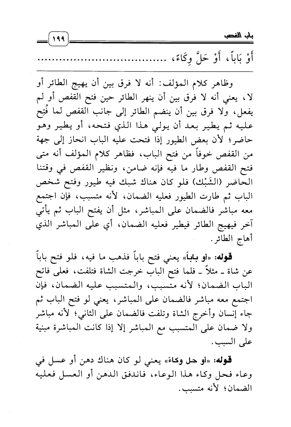 قوله: «أو باباً» يعني فتح باباً فذهب ما فيه، فلو فتح باباً عن شاة ـ مثلاً ـ فلما فتح الباب خرجت الشاة فتلفت، فعلى فاتح الباب الضمان؛ لأنه متسبب، والمتسبب عليه الضمان، فإن اجتمع معه مباشر فالضمان على المباشر، يعني لو فتح الباب ثم جاء إنسان وأخرج الشاة وتلفت فالضمان على الثاني؛ لأنه مباشر ولا ضمان على المتسبب مع المباشر إلا إذا كانت المباشرة مبنية على السبب.