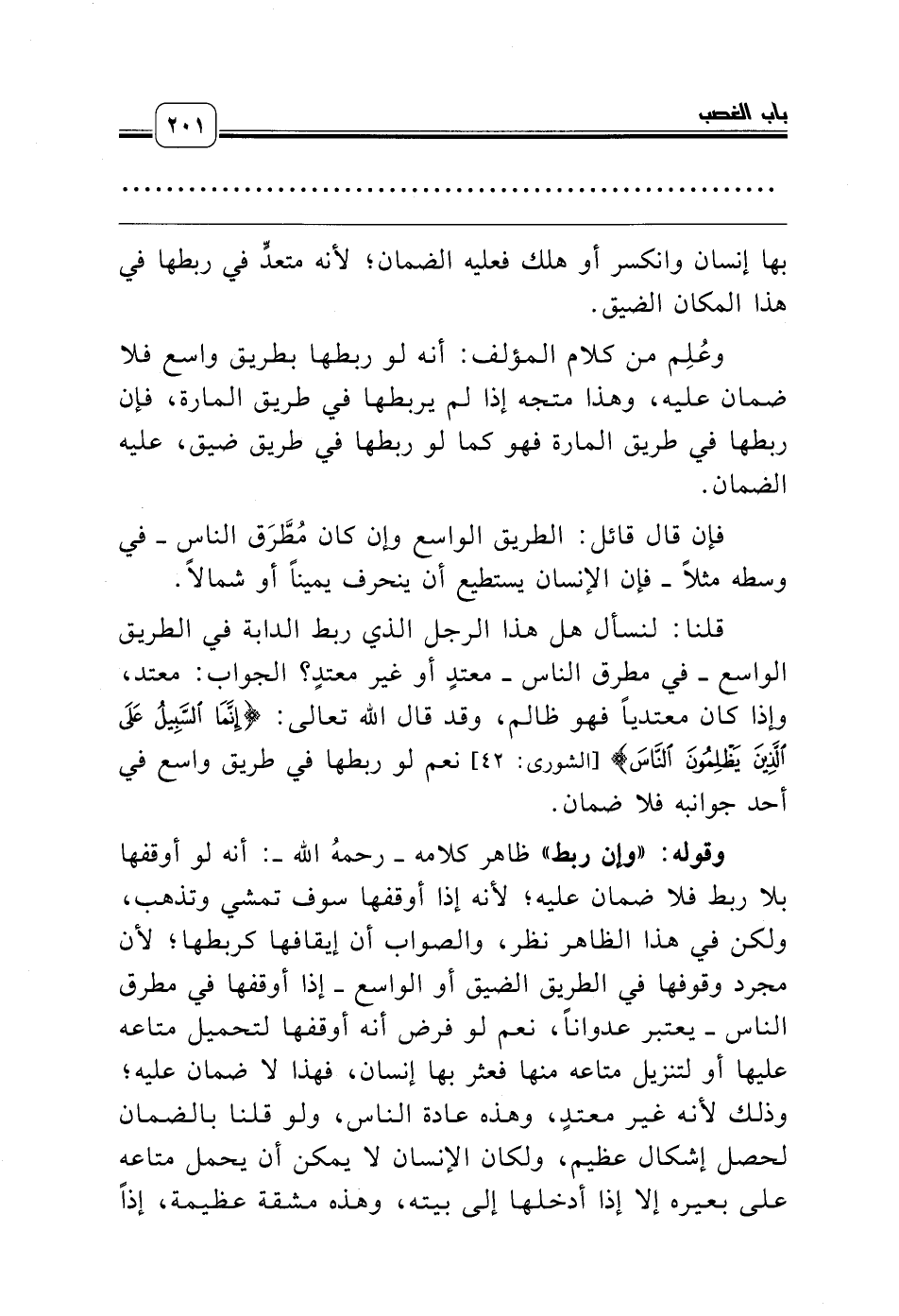 قلنا: لنسأل هل هذا الرجل الذي ربط الدابة في الطريق الواسع ـ في مطرق الناس ـ معتدٍ أو غير معتدٍ؟ الجواب: معتد، وإذا كان معتدياً فهو ظالم، وقد قال الله تعالى: {إِنَّمَا السَّبِيلُ عَلَى الَّذِينَ يَظْلِمُونَ النَّاسَ} [الشورى: 42] نعم لو ربطها في طريق واسع في أحد جوانبه فلا ضمان.