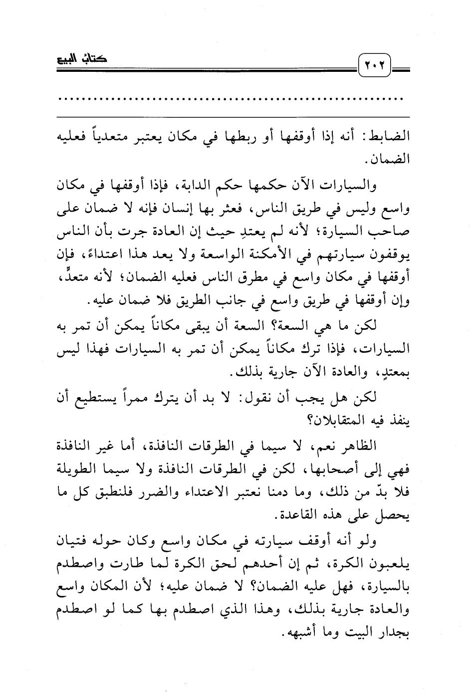 والسيارات الآن حكمها حكم الدابة، فإذا أوقفها في مكان واسع وليس في طريق الناس، فعثر بها إنسان فإنه لا ضمان على صاحب السيارة؛ لأنه لم يعتدِ حيث إن العادة جرت بأن الناس يوقفون سيارتهم في الأمكنة الواسعة ولا يعد هذا اعتداءً، فإن أوقفها في مكان واسع في مطرق الناس فعليه الضمان؛ لأنه متعدٍّ، وإن أوقفها في طريق واسع في جانب الطريق فلا ضمان عليه.