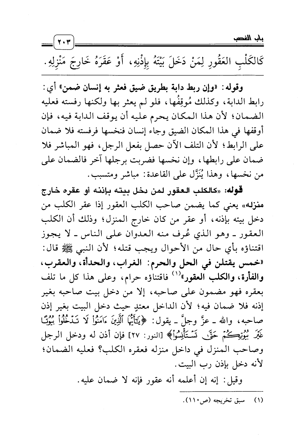 قوله: «كالكلب العقور لمن دخل بيته بإذنه أو عقره خارج منزله» يعني كما يضمن صاحب الكلب العقور إذا عقر الكلب من دخل بيته بإذنه، أو عقر من كان خارج المنزل؛ وذلك أن الكلب العقور ـ وهو الذي عُرف منه العدوان على الناس ـ لا يجوز اقتناؤه بأي حال من الأحوال ويجب قتله؛ لأن النبي صلّى الله عليه وسلّم قال: «خمس يقتلن في الحل والحرم: الغراب، والحدأة، والعقرب، والفأرة، والكلب العقور» (¬1) فاقتناؤه حرام، وعلى هذا كل ما تلف بعقره فهو مضمون على صاحبه، إلا من دخل بيت صاحبه بغير إذنه فلا ضمان فيه؛ لأن الداخل معتدٍ حيث دخل البيت بغير إذن صاحبه، والله ـ عزّ وجل ـ يقول: {يَاأَيُّهَا الَّذِينَ آمَنُوا لاَ تَدْخُلُوا بُيُوتًا غَيْرَ بُيُوتِكُمْ حَتَّى تَسْتَأْنِسُوا} [النور: 27] فإن أذن له ودخل الرجل وصاحب المنزل في داخل منزله فعقره الكلب؟ فعليه الضمان؛ لأنه دخل بإذن رب البيت.
