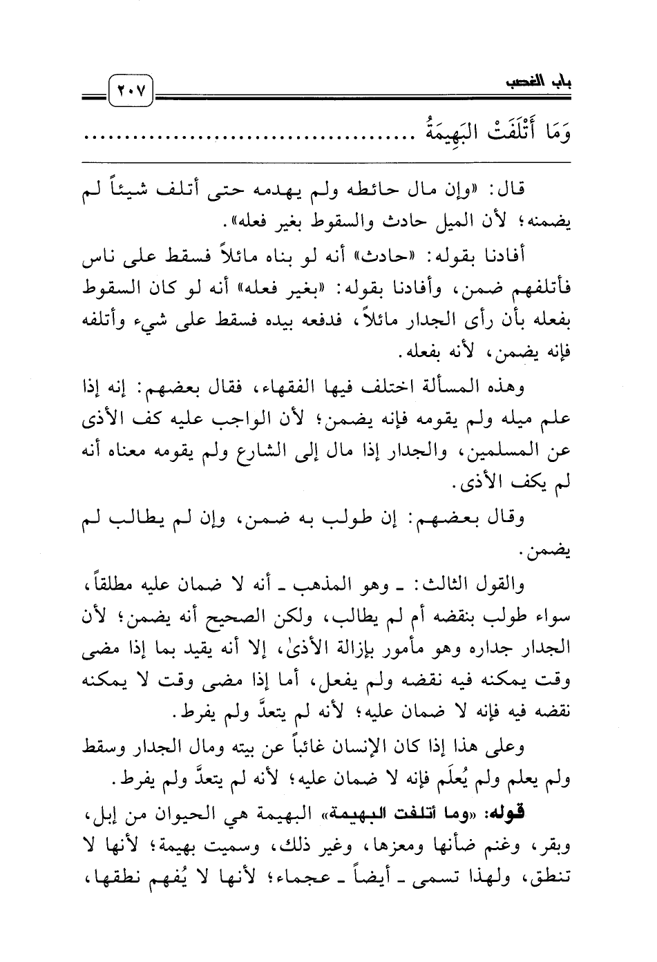 وَمَا أَتْلَفَتْ البَهِيمَةُ مِنَ الزَّرْعِ لَيْلاً ضَمِنَهُ صَاحِبُهَا وَعَكْسُهُ النَّهَارُ، إِلاَّ أَنْ تُرْسَلَ بِقُرْبِ مَا تُتْلِفُهُ عَادَةً. ............