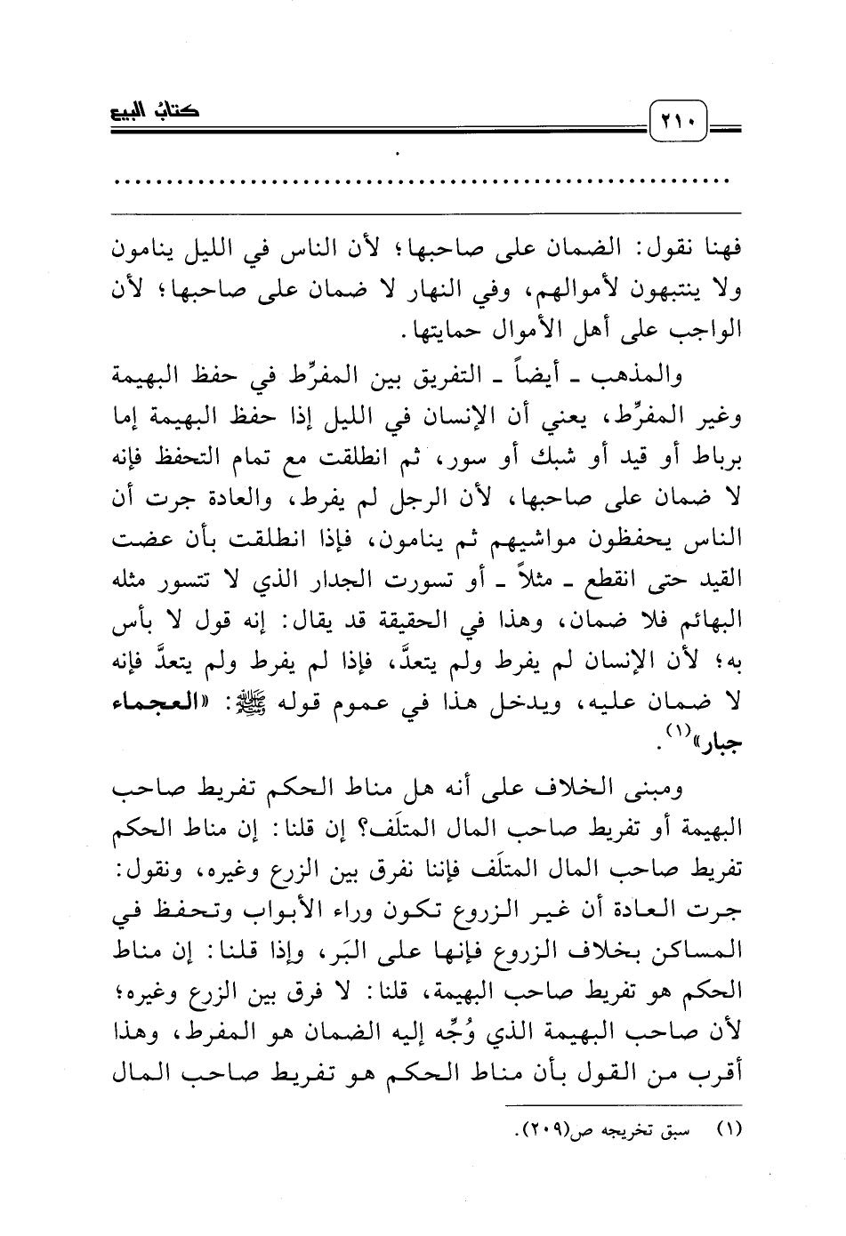 والمذهب ـ أيضاً ـ التفريق بين المفرِّط في حفظ البهيمة وغير المفرِّط، يعني أن الإنسان في الليل إذا حفظ البهيمة إما برباط أو قيد أو شبك أو سور، ثم انطلقت مع تمام التحفظ فإنه لا ضمان على صاحبها، لأن الرجل لم يفرط، والعادة جرت أن الناس يحفظون مواشيهم ثم ينامون، فإذا انطلقت بأن عضت القيد حتى انقطع ـ مثلاً ـ أو تسورت الجدار الذي لا تتسور مثله البهائم فلا ضمان، وهذا في الحقيقة قد يقال: إنه قول لا بأس به؛ لأن الإنسان لم يفرط ولم يتعدَّ، فإذا لم يفرط ولم يتعدَّ فإنه لا ضمان عليه، ويدخل هذا في عموم قوله صلّى الله عليه وسلّم: «العجماء جبار» (¬1).