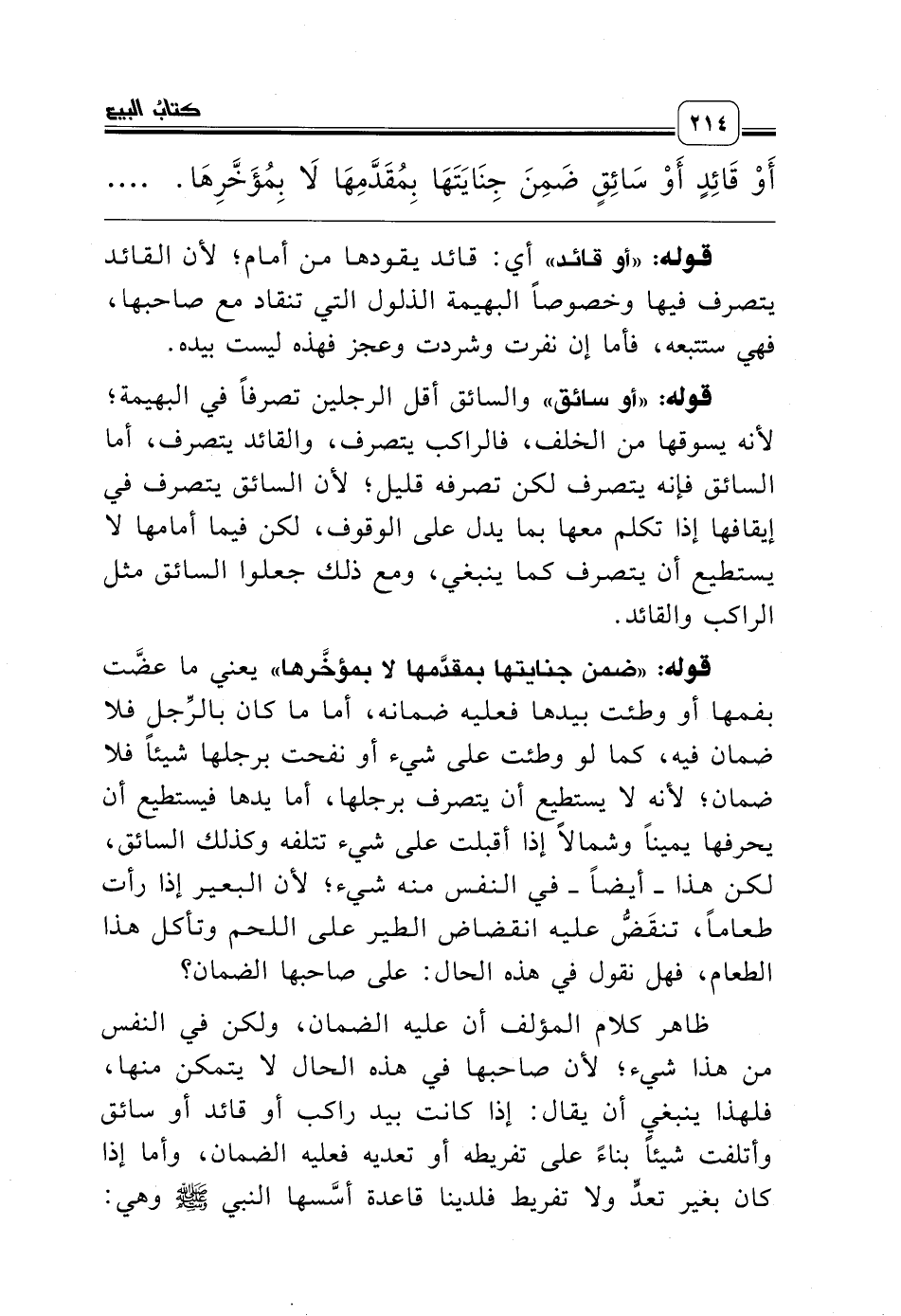 قوله: «أو سائق» والسائق أقل الرجلين تصرفاً في البهيمة؛ لأنه يسوقها من الخلف، فالراكب يتصرف، والقائد يتصرف، أما السائق فإنه يتصرف لكن تصرفه قليل؛ لأن السائق يتصرف في إيقافها إذا تكلم معها بما يدل على الوقوف، لكن فيما أمامها لا يستطيع أن يتصرف كما ينبغي، ومع ذلك جعلوا السائق مثل الراكب والقائد.