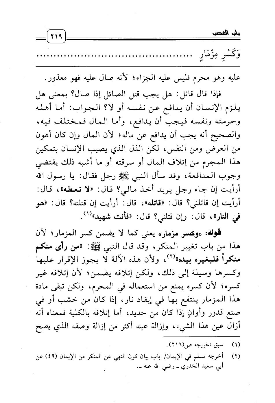قوله: «وكسر مزمار» يعني كما لا يضمن كسر المزمار؛ لأن هذا من باب تغيير المنكر، وقد قال النبي صلّى الله عليه وسلّم: «من رأى منكم منكراً فليغيره بيده» (¬2)، ولأن هذه الآلة لا يجوز الإقرار عليها وكسرها وسيلة إلى ذلك، ولكن إتلافه يضمن؛ لأن إتلافه غير كسره؛ لأن كسره يمنع من استعماله في المحرم، ولكن تبقى مادة هذا المزمار ينتفع بها في إيقاد نار، إذا كان من خشب أو في صنع قدور وأوانٍ إذا كان من حديد، أما إتلافه بالكلية فمعناه أنه أزال عين هذا الشيء، وإزالة عينه أكثر من إزالة وصفه الذي يصح