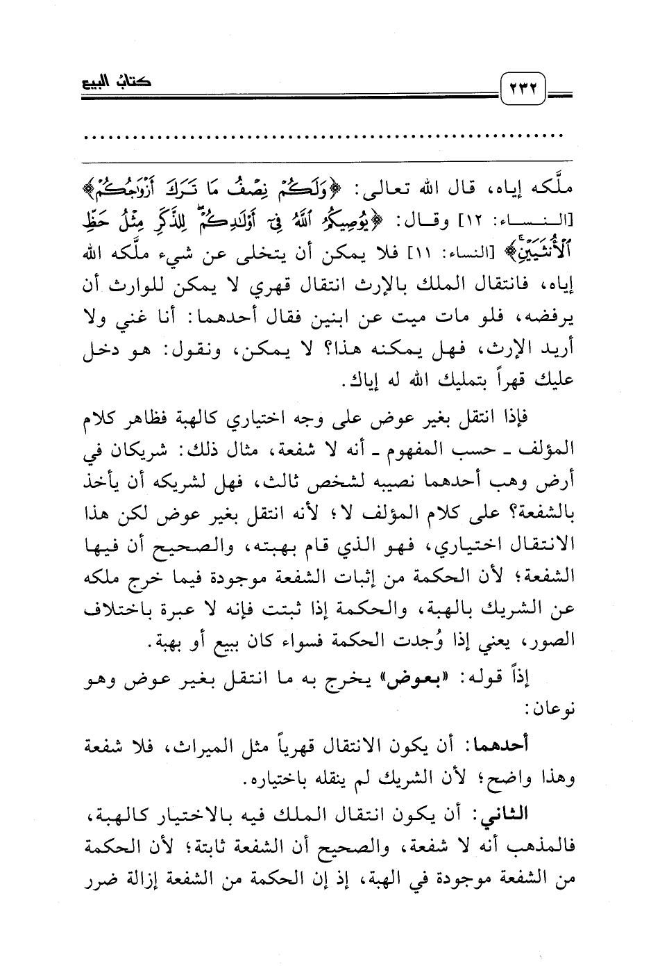 الثاني: أن يكون انتقال الملك فيه بالاختيار كالهبة، فالمذهب أنه لا شفعة، والصحيح أن الشفعة ثابتة؛ لأن الحكمة من الشفعة موجودة في الهبة، إذ إن الحكمة من الشفعة إزالة ضرر