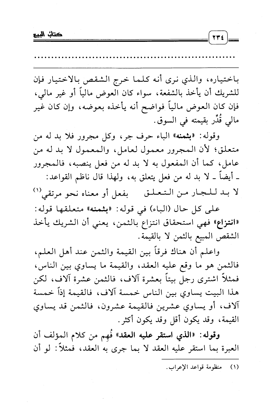 وقوله: «بثمنه» الباء حرف جر، وكل مجرور فلا بد له من متعلق؛ لأن المجرور معمول لعامل، والمعمول لا بد له من عامل، كما أن المفعول به لا بد له من فعل ينصبه، فالمجرور ـ أيضاً ـ لا بد له من فعل يتعلق به، ولهذا قال ناظم القواعد: