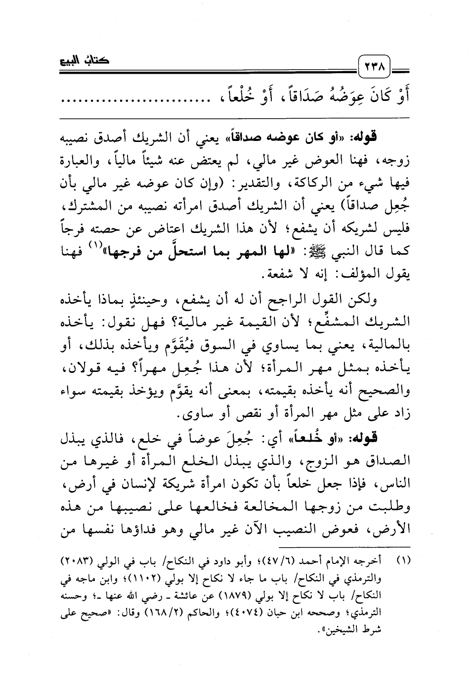 قوله: «أو كان عوضه صداقاً» يعني أن الشريك أصدق نصيبه زوجه، فهنا العوض غير مالي، لم يعتض عنه شيئاً مالياً، والعبارة فيها شيء من الركاكة، والتقدير: (وإن كان عوضه غير مالي بأن جُعِل صداقاً) يعني أن الشريك أصدق امرأته نصيبه من المشترك، فليس لشريكه أن يشفع؛ لأن هذا الشريك اعتاض عن حصته فرجاً كما قال النبي صلّى الله عليه وسلّم: «لها المهر بما استحلَّ من فرجها» (¬1) فهنا يقول المؤلف: إنه لا شفعة.