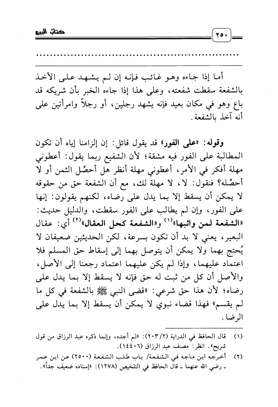 وقوله: «على الفور» قد يقول قائل: إن إلزامنا إياه أن تكون المطالبة على الفور فيه مشقة؛ لأن الشفيع ربما يقول: أعطوني مهلة أفكر في الأمر، أعطوني مهلة أنظر هل أحصِّل الثمن أو لا أحصِّله؟ فنقول: لا، لا مهلة لك، مع أن الشفعة حق من حقوقه لا يمكن أن يسقط إلا بما يدل على رضاه، لكنهم يقولون: إنها على الفور، وإن لم يطالب على الفور سقطت، والدليل حديث: «الشفعة لمن واثبها» (¬1) و «الشفعة كحل العقال» (¬2) أي: عقال البعير، يعني لا بد أن تكون بسرعة، لكن الحديثين ضعيفان لا يُحتج بهما ولا يمكن أن يتوصل بهما إلى إسقاط حق المسلم فلا اعتماد عليهما، وإذا لم يكن عليهما اعتماد رجعنا إلى الأصل، والأصل أن كل من ثبت له حق فإنه لا يسقط إلا بما يدل على رضاه؛ لأن هذا حق شرعي: «قضى النبي صلّى الله عليه وسلّم بالشفعة في كل ما لم يقسم» فهذا قضاء نبوي لا يمكن أن يسقط إلا بما يدل على الرضا.