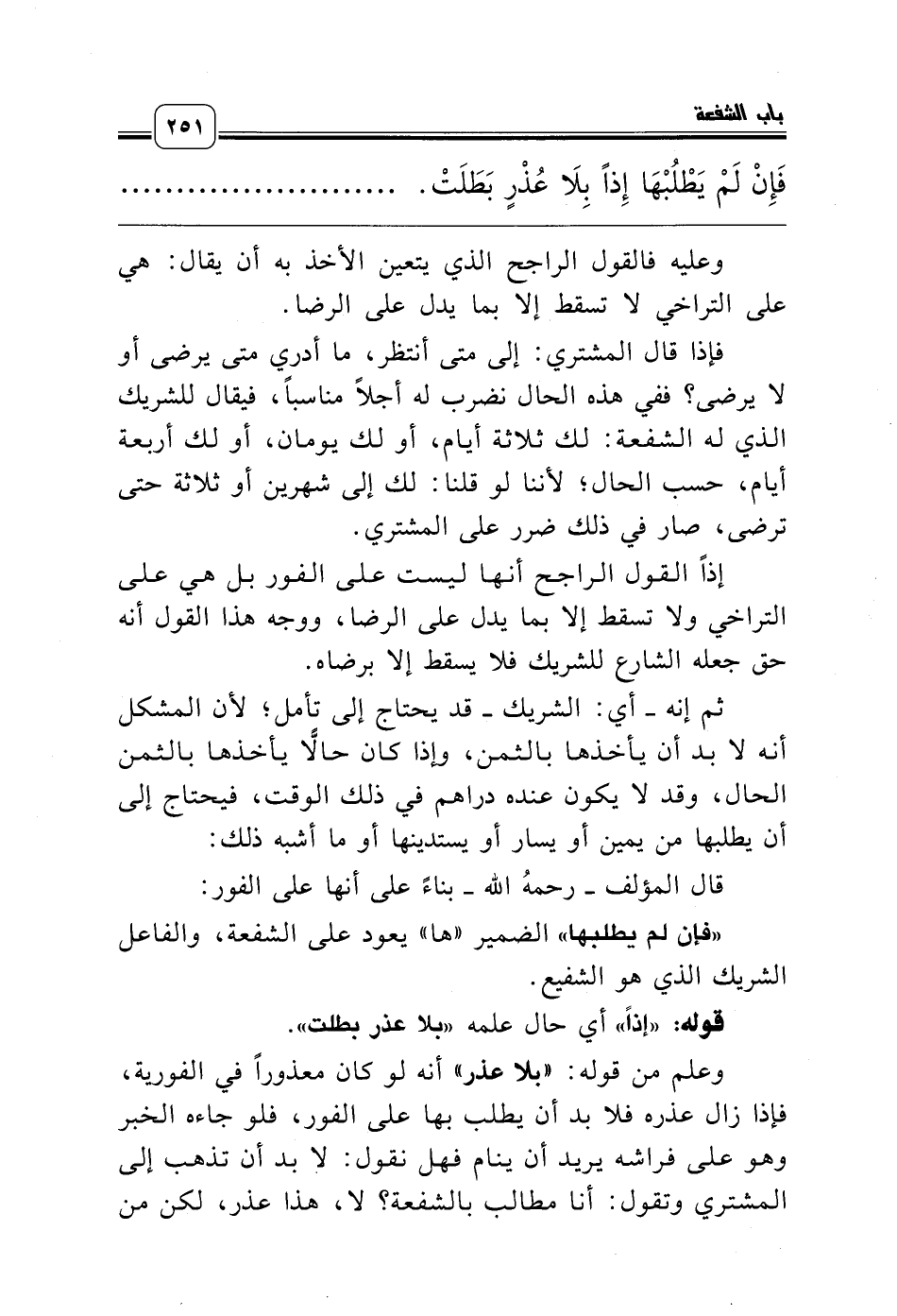 وعلم من قوله: «بلا عذر» أنه لو كان معذوراً في الفورية، فإذا زال عذره فلا بد أن يطلب بها على الفور، فلو جاءه الخبر وهو على فراشه يريد أن ينام فهل نقول: لا بد أن تذهب إلى المشتري وتقول: أنا مطالب بالشفعة؟ لا، هذا عذر، لكن من