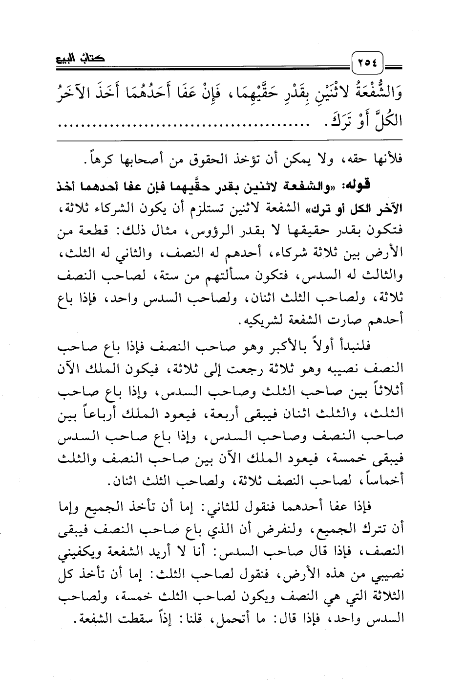 قوله: «والشفعة لاثنين بقدر حقَّيهما فإن عفا أحدهما أخذ الآخر الكل أو ترك» الشفعة لاثنين تستلزم أن يكون الشركاء ثلاثة، فتكون بقدر حقيقها لا بقدر الرؤوس، مثال ذلك: قطعة من الأرض بين ثلاثة شركاء، أحدهم له النصف، والثاني له الثلث، والثالث له السدس، فتكون مسألتهم من ستة، لصاحب النصف ثلاثة، ولصاحب الثلث اثنان، ولصاحب السدس واحد، فإذا باع أحدهم صارت الشفعة لشريكيه.