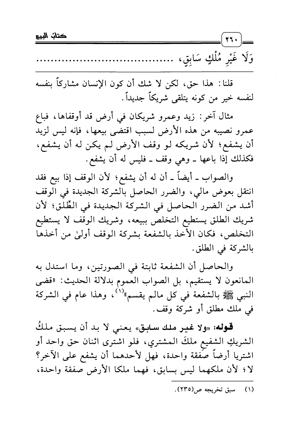 قوله: «ولا غير ملك سابق» يعني لا بد أن يسبق ملكُ الشريكِ الشفيعِ ملكَ المشتري، فلو اشترى اثنان حق واحد أو اشتريا أرضاً صفقة واحدة، فهل لأحدهما أن يشفع على الآخر؟ لا؛ لأن ملكهما ليس بسابق، فهما ملكا الأرض صفقة واحدة،