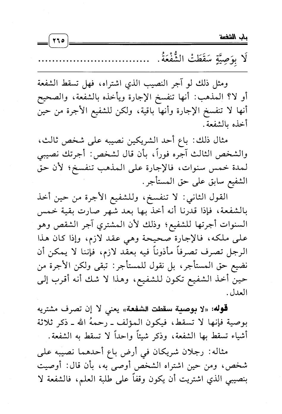 ومثل ذلك لو آجر النصيب الذي اشتراه، فهل تسقط الشفعة أو لا؟ المذهب: أنها تنفسخ الإجارة ويأخذه بالشفعة، والصحيح أنها لا تنفسخ الإجارة وأنها باقية، ولكن للشفيع الأجرة من حين أخذه بالشفعة.