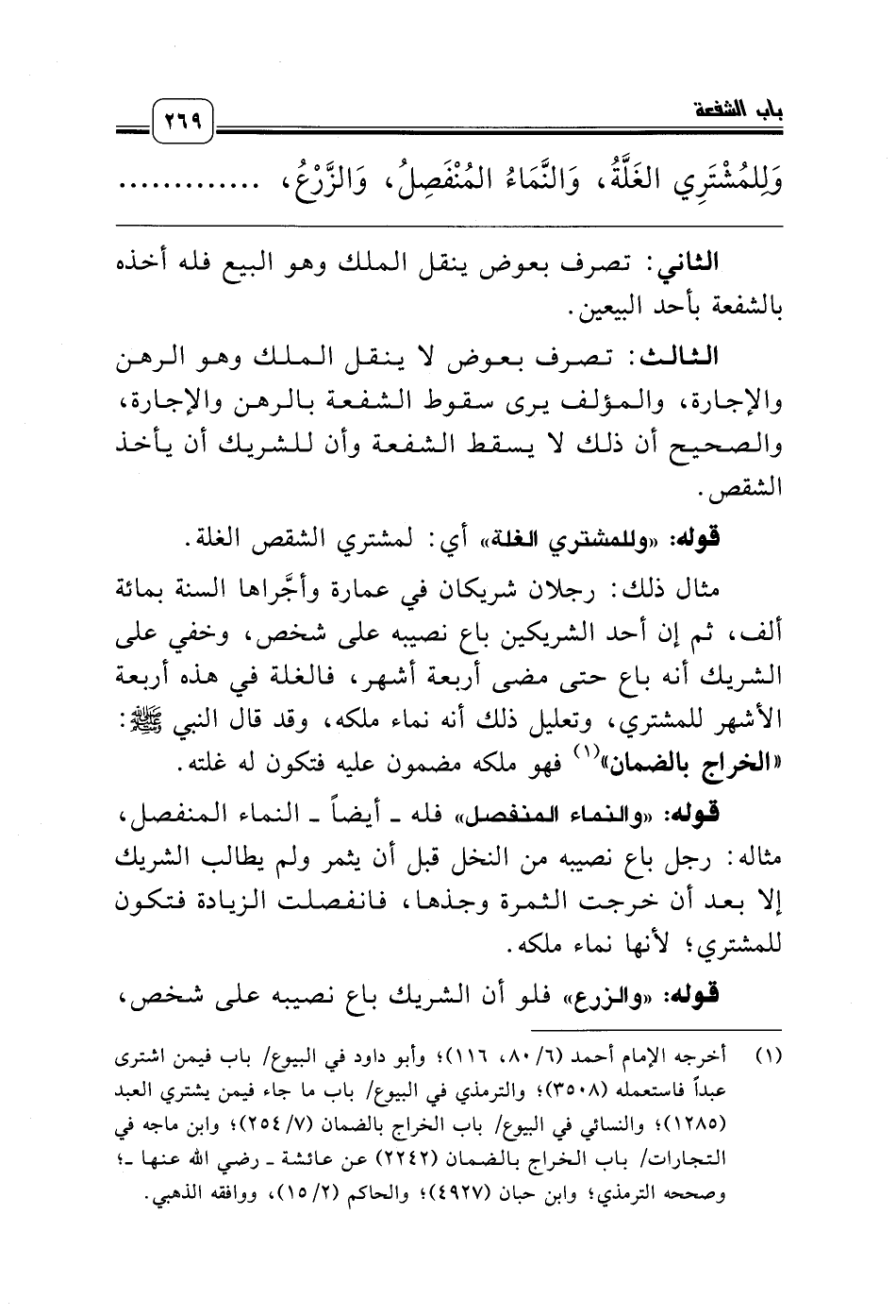 مثال ذلك: رجلان شريكان في عمارة وأجَّراها السنة بمائة ألف، ثم إن أحد الشريكين باع نصيبه على شخص، وخفي على الشريك أنه باع حتى مضى أربعة أشهر، فالغلة في هذه أربعة الأشهر للمشتري، وتعليل ذلك أنه نماء ملكه، وقد قال النبي صلّى الله عليه وسلّم: «الخراج بالضمان» (¬1) فهو ملكه مضمون عليه فتكون له غلته.