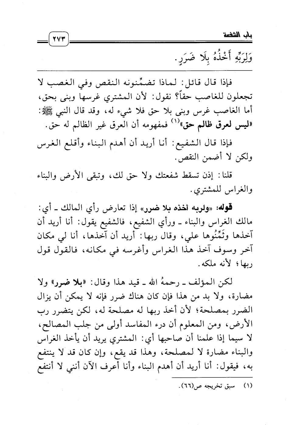 قوله: «ولربه أخذه بلا ضرر» إذا تعارض رأي المالك ـ أي: مالك الغراس والبناء ـ ورأي الشفيع، فالشفيع يقول: أنا أريد أن آخذها وثَمِّنُوها علي، وقال ربها: أريد أن آخذها، أنا لي مكان آخر وسوف آخذ هذا الغراس وأغرسه في مكانه، فالقول قول ربها؛ لأنه ملكه.