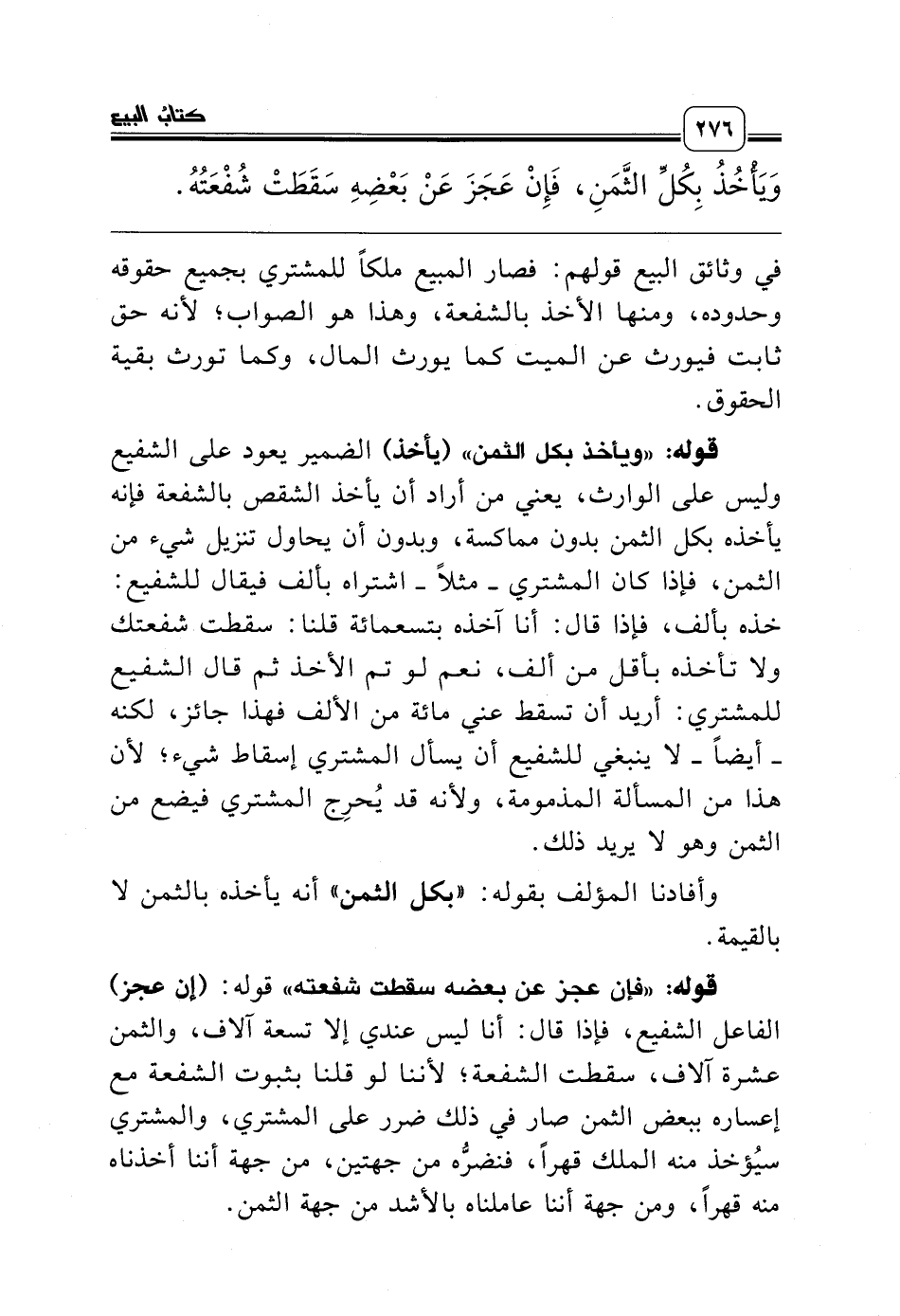 قوله: «ويأخذ بكل الثمن» (يأخذ) الضمير يعود على الشفيع وليس على الوارث، يعني من أراد أن يأخذ الشقص بالشفعة فإنه يأخذه بكل الثمن بدون مماكسة، وبدون أن يحاول تنزيل شيء من الثمن، فإذا كان المشتري ـ مثلاً ـ اشتراه بألف فيقال للشفيع: خذه بألف، فإذا قال: أنا آخذه بتسعمائة قلنا: سقطت شفعتك ولا تأخذه بأقل من ألف، نعم لو تم الأخذ ثم قال الشفيع للمشتري: أريد أن تسقط عني مائة من الألف فهذا جائز، لكنه ـ أيضاً ـ لا ينبغي للشفيع أن يسأل المشتري إسقاط شيء؛ لأن هذا من المسألة المذمومة، ولأنه قد يُحرِج المشتري فيضع من الثمن وهو لا يريد ذلك.