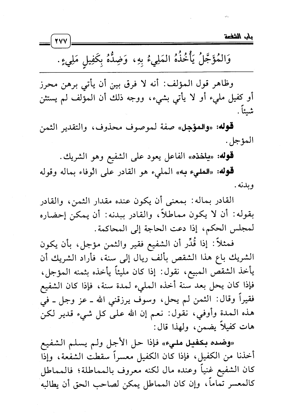 فمثلاً: إذا قُدِّر أن الشفيع فقير والثمن مؤجل، بأن يكون الشريك باع هذا الشقص بألف ريال إلى سنة، فأراد الشريك أن يأخذ الشقص المبيع، نقول: إذا كان مليئاً يأخذه بثمنه المؤجل، فإذا كان يحل بعد سنة أخذه المليء لمدة سنة، فإذا كان الشفيع فقيراً وقال: الثمن لم يحل، وسوف يرزقني الله ـ عز وجل ـ في هذه المدة وأوفي، نقول: نعم إن الله على كل شيء قدير لكن هات كفيلاً يضمن، ولهذا قال: