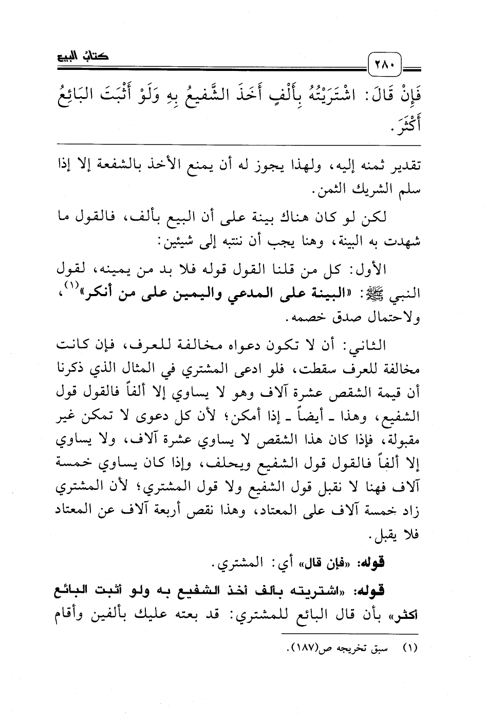الثاني: أن لا تكون دعواه مخالفة للعرف، فإن كانت مخالفة للعرف سقطت، فلو ادعى المشتري في المثال الذي ذكرنا أن قيمة الشقص عشرة آلاف وهو لا يساوي إلا ألفاً فالقول قول الشفيع، وهذا ـ أيضاً ـ إذا أمكن؛ لأن كل دعوى لا تمكن غير مقبولة، فإذا كان هذا الشقص لا يساوي عشرة آلاف، ولا يساوي إلا ألفاً فالقول قول الشفيع ويحلف، وإذا كان يساوي خمسة آلاف فهنا لا نقبل قول الشفيع ولا قول المشتري؛ لأن المشتري زاد خمسة آلاف على المعتاد، وهذا نقص أربعة آلاف عن المعتاد فلا يقبل.