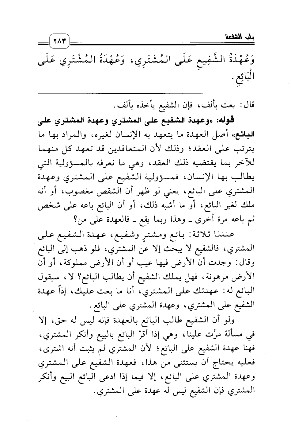 ولو أن الشفيع طالب البائع بالعهدة فإنه ليس له حق، إلا في مسألة مرَّت علينا، وهي إذا أقرّ البائع بالبيع وأنكر المشتري، فهنا عهدة الشفيع على البائع؛ لأن المشتري لم يثبت أنه اشترى، فعليه يحتاج أن يستثنى من هذا، فعهدة الشفيع على المشتري وعهدة المشتري على البائع، إلا فيما إذا ادعى البائع البيع وأنكر المشتري فإن الشفيع ليس له عهدة على المشتري.