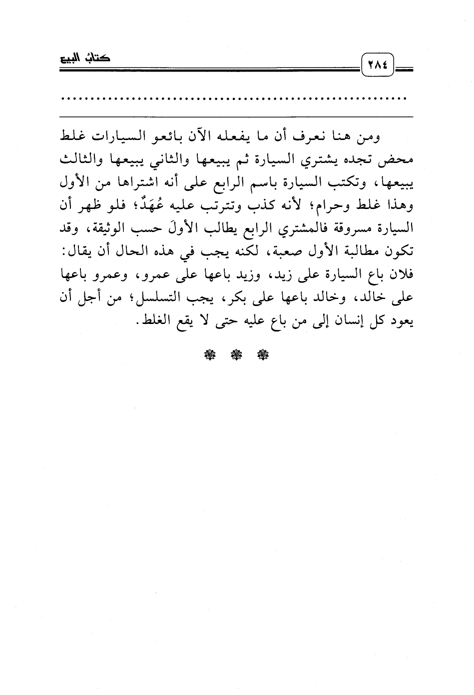 ومن هنا نعرف أن ما يفعله الآن بائعو السيارات غلط محض تجده يشتري السيارة ثم يبيعها والثاني يبيعها والثالث يبيعها، وتكتب السيارة باسم الرابع على أنه اشتراها من الأول وهذا غلط وحرام؛ لأنه كذب وتترتب عليه عُهَدٌ؛ فلو ظهر أن السيارة مسروقة فالمشتري الرابع يطالب الأولَ حسب الوثيقة، وقد تكون مطالبة الأول صعبة، لكنه يجب في هذه الحال أن يقال: فلان باع السيارة على زيد، وزيد باعها على عمرو، وعمرو باعها على خالد، وخالد باعها على بكر، يجب التسلسل؛ من أجل أن يعود كل إنسان إلى من باع عليه حتى لا يقع الغلط.