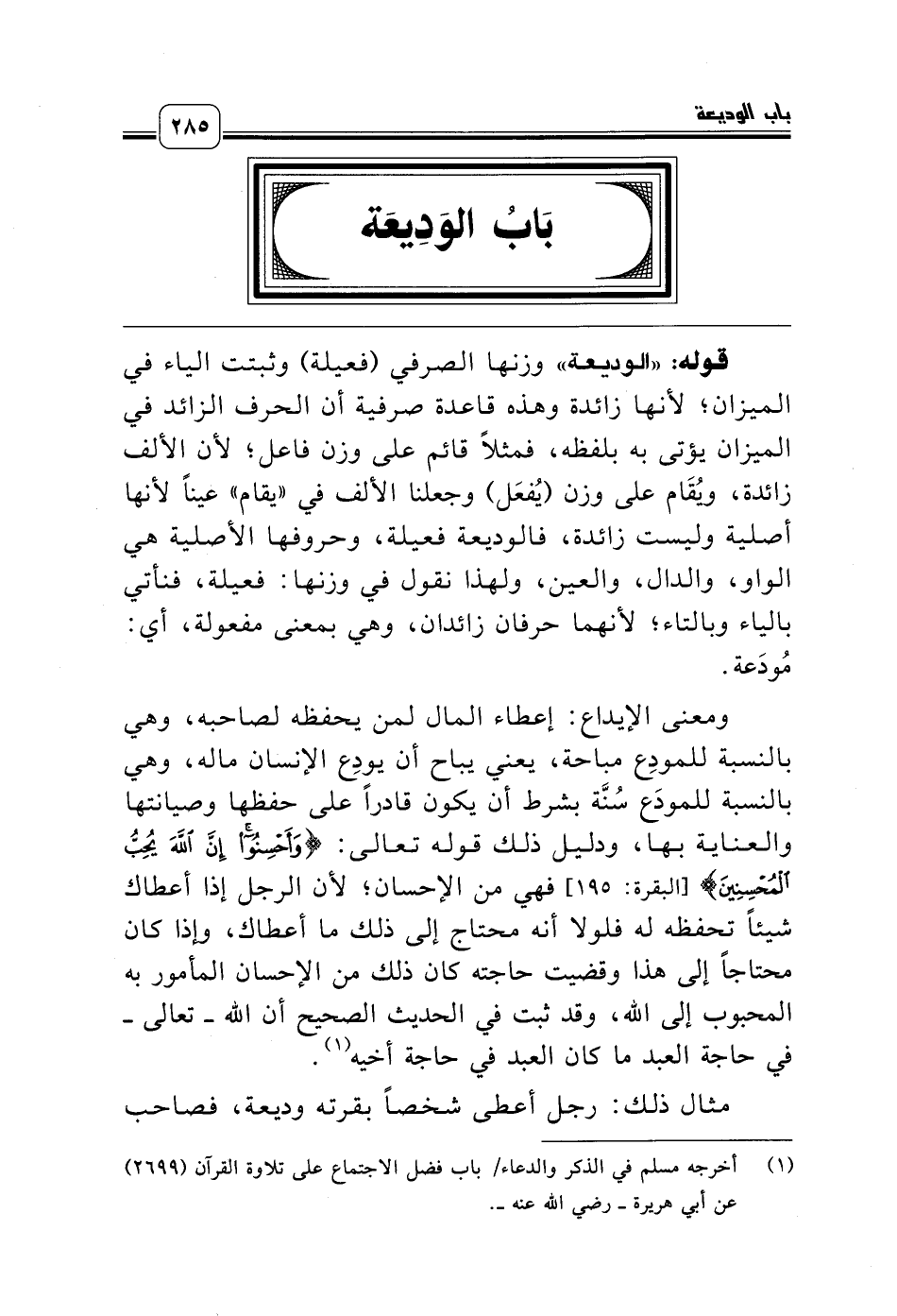قوله: «الوديعة» وزنها الصرفي (فعيلة) وثبتت الياء في الميزان؛ لأنها زائدة وهذه قاعدة صرفية أن الحرف الزائد في الميزان يؤتى به بلفظه، فمثلاً قائم على وزن فاعل؛ لأن الألف زائدة، ويُقَام على وزن (يُفعَل) وجعلنا الألف في «يقام» عيناً لأنها أصلية وليست زائدة، فالوديعة فعيلة، وحروفها الأصلية هي الواو، والدال، والعين، ولهذا نقول في وزنها: فعيلة، فنأتي بالياء وبالتاء؛ لأنهما حرفان زائدان، وهي بمعنى مفعولة، أي: مُودَعة.