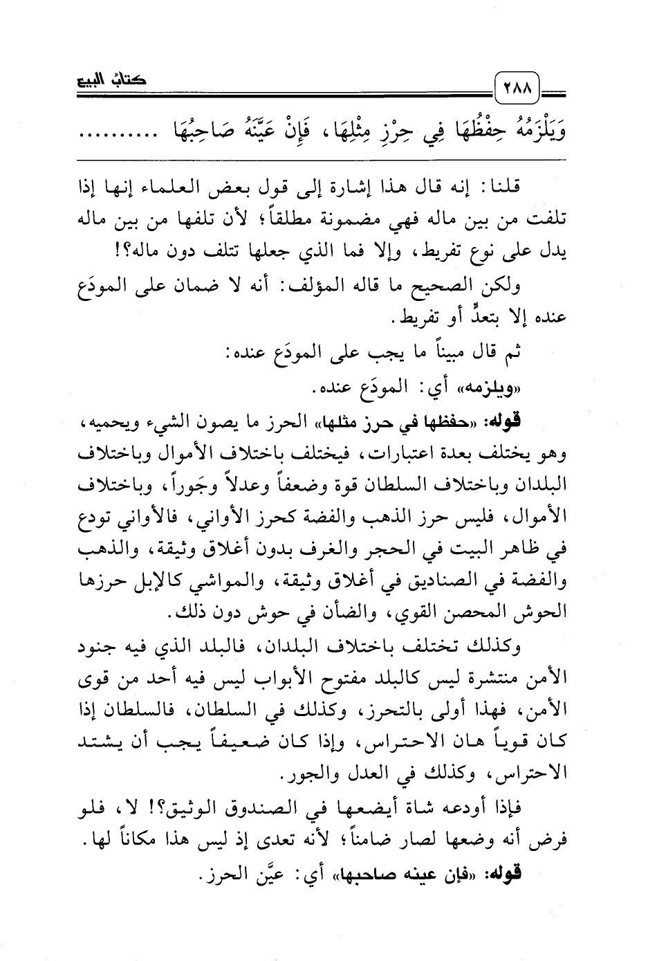قوله: «حفظها في حرز مثلها» الحرز ما يصون الشيء ويحميه، وهو يختلف بعدة اعتبارات، فيختلف باختلاف الأموال وباختلاف البلدان وباختلاف السلطان قوة وضعفاً وعدلاً وجَوراً، وباختلاف الأموال، فليس حرز الذهب والفضة كحرز الأواني، فالأواني تودع في ظاهر البيت في الحجر والغرف بدون أغلاق وثيقة، والذهب والفضة في الصناديق في أغلاق وثيقة، والمواشي كالإبل حرزها الحوش المحصن القوي، والضأن في حوش دون ذلك.