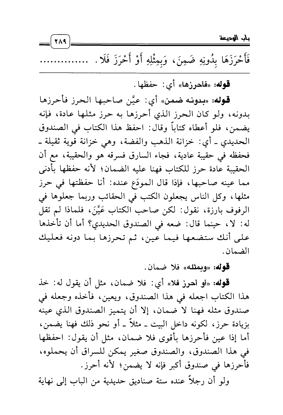 قوله: «أو أحرز فلا» أي: فلا ضمان، مثل أن يقول له: خذ هذا الكتاب اجعله في هذا الصندوق، ويعين، فأخذه وجعله في صندوق مثله فهنا لا ضمان، إلا أن يتميز الصندوق الذي عينه بزيادة حرز، لكونه داخل البيت ـ مثلاً ـ أو نحو ذلك فهنا يضمن، أما إذا عين فأحرزها بأقوى فلا ضمان، مثل أن يقول: احفظها في هذا الصندوق، والصندوق صغير يمكن للسراق أن يحملوه، فأحرزها في صندوق أكبر فإنه لا يضمن؛ لأنه أحرز.