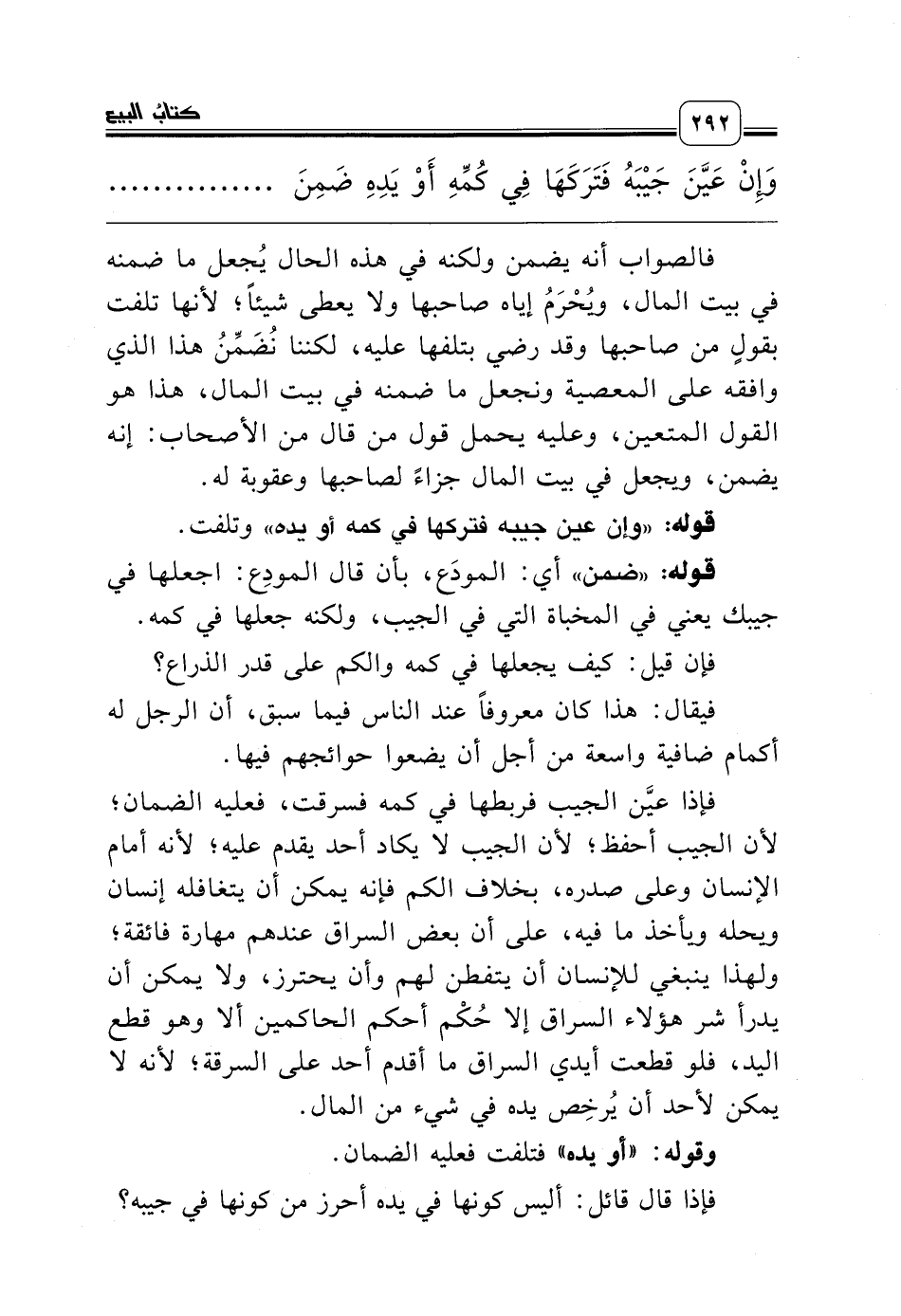 فإذا عيَّن الجيب فربطها في كمه فسرقت، فعليه الضمان؛ لأن الجيب أحفظ؛ لأن الجيب لا يكاد أحد يقدم عليه؛ لأنه أمام الإنسان وعلى صدره، بخلاف الكم فإنه يمكن أن يتغافله إنسان ويحله ويأخذ ما فيه، على أن بعض السراق عندهم مهارة فائقة؛ ولهذا ينبغي للإنسان أن يتفطن لهم وأن يحترز، ولا يمكن أن يدرأ شر هؤلاء السراق إلا حُكْم أحكم الحاكمين ألا وهو قطع اليد، فلو قطعت أيدي السراق ما أقدم أحد على السرقة؛ لأنه لا يمكن لأحد أن يُرخِص يده في شيء من المال.