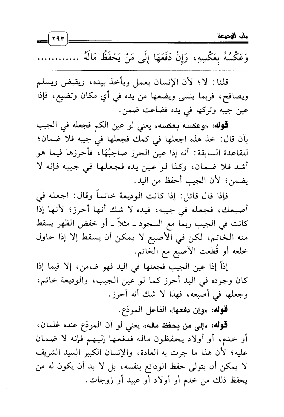 فإذا قال قائل: إذا كانت الوديعة خاتماً وقال: اجعله في أصبعك، فجعله في جيبه، فيده لا شك أنها أحرز؛ لأنها إذا كانت في الجيب ربما مع السجود ـ مثلاً ـ أو خفض الظهر يسقط منه الخاتم، لكن في الأصبع لا يمكن أن يسقط إلا إذا حاول خلعه أو قُطعت الأصبع مع الخاتم.