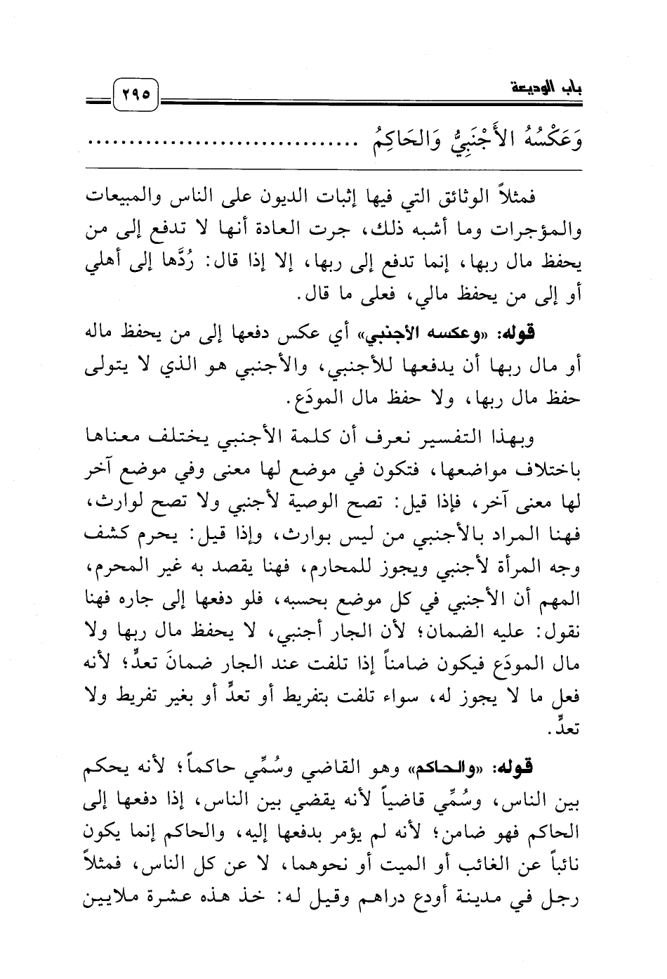 وبهذا التفسير نعرف أن كلمة الأجنبي يختلف معناها باختلاف مواضعها، فتكون في موضع لها معنى وفي موضع آخر لها معنى آخر، فإذا قيل: تصح الوصية لأجنبي ولا تصح لوارث، فهنا المراد بالأجنبي من ليس بوارث، وإذا قيل: يحرم كشف وجه المرأة لأجنبي ويجوز للمحارم، فهنا يقصد به غير المحرم، المهم أن الأجنبي في كل موضع بحسبه، فلو دفعها إلى جاره فهنا نقول: عليه الضمان؛ لأن الجار أجنبي، لا يحفظ مال ربها ولا مال المودَع فيكون ضامناً إذا تلفت عند الجار ضمانَ تعدٍّ؛ لأنه فعل ما لا يجوز له، سواء تلفت بتفريط أو تعدٍّ أو بغير تفريط ولا تعدٍّ.