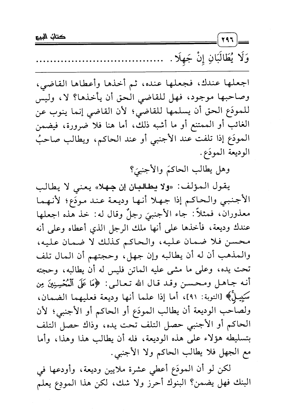 يقول المؤلف: «ولا يطالبان إن جهلا» يعني لا يطالب الأجنبي والحاكم إذا جهلا أنها وديعة عند مودَع؛ لأنهما معذوران، فمثلاً: جاء الأجنبيَ رجلٌ وقال له: خذ هذه اجعلها عندك وديعة، فأخذها على أنها ملك الرجل الذي أعطاه وعلى أنه محسن فلا ضمان عليه، والحاكم كذلك لا ضمان عليه، والمذهب أن له أن يطالبه وإن جهل، وحجتهم أن المال تلف تحت يده، وعلى ما مشى عليه الماتن فليس له أن يطالبه، وحجته أنه جاهل ومحسن وقد قال الله تعالى: {مَا عَلَى الْمُحْسِنِينَ مِنْ سَبِيلٍ} [التوبة: 91]، أما إذا علما أنها وديعة فعليهما الضمان، ولصاحب الوديعة أن يطالب المودَع أو الحاكم أو الأجنبي؛ لأن الحاكم أو الأجنبي حصل التلف تحت يده، وذاك حصل التلف بتسليطه هؤلاء على هذه الوديعة، فله أن يطالب هذا وهذا، وأما مع الجهل فلا يطالب الحاكم ولا الأجنبي.