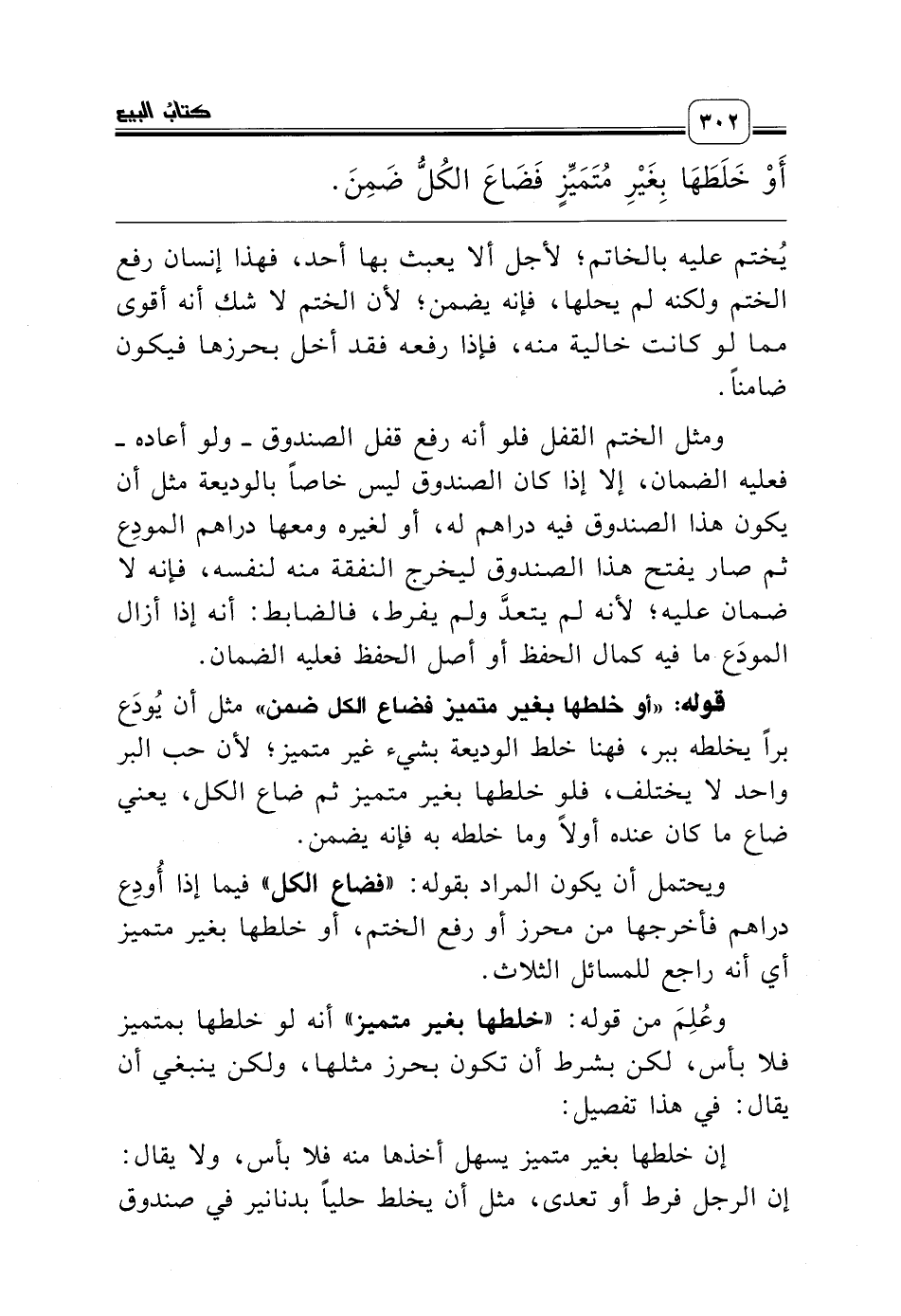 ومثل الختم القفل فلو أنه رفع قفل الصندوق ـ ولو أعاده ـ فعليه الضمان، إلا إذا كان الصندوق ليس خاصاً بالوديعة مثل أن يكون هذا الصندوق فيه دراهم له، أو لغيره ومعها دراهم المودِع ثم صار يفتح هذا الصندوق ليخرج النفقة منه لنفسه، فإنه لا ضمان عليه؛ لأنه لم يتعدَّ ولم يفرط، فالضابط: أنه إذا أزال المودَع ما فيه كمال الحفظ أو أصل الحفظ فعليه الضمان.
