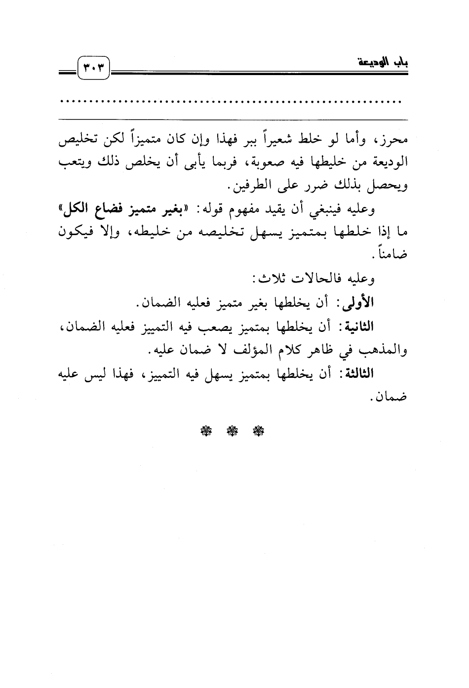 وعليه فينبغي أن يقيد مفهوم قوله: «بغير متميز فضاع الكل» ما إذا خلطها بمتميز يسهل تخليصه من خليطه، وإلا فيكون ضامناً.