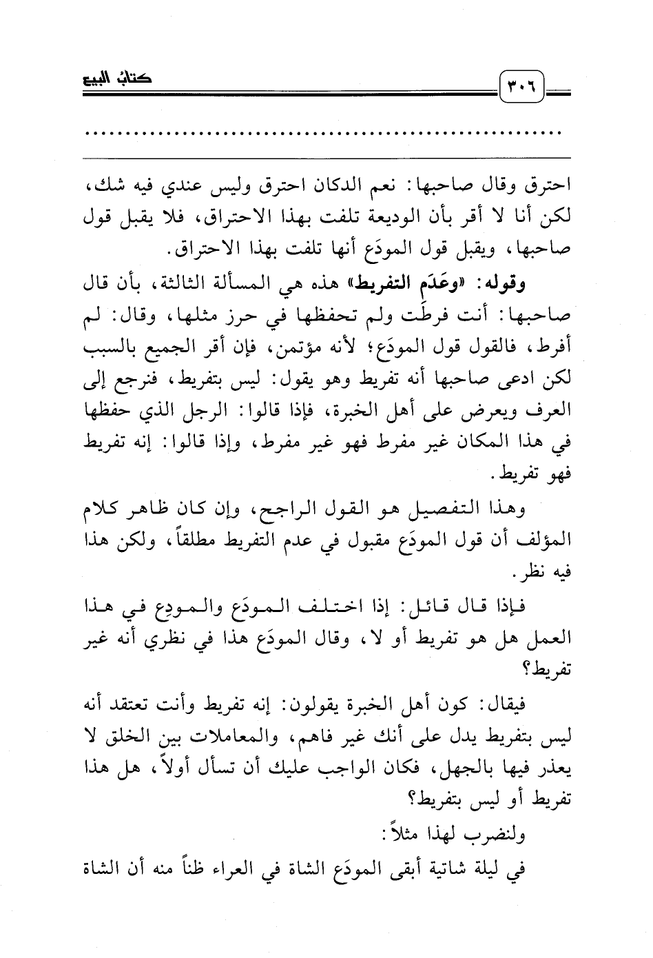 وهذا التفصيل هو القول الراجح، وإن كان ظاهر كلام المؤلف أن قول المودَع مقبول في عدم التفريط مطلقاً، ولكن هذا فيه نظر.