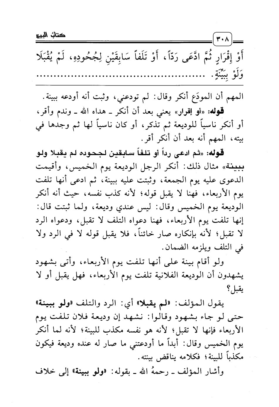 يقول المؤلف: «لم يقبلا» أي: الرد والتلف «ولو ببينة» حتى لو جاء بشهود وقالوا: نشهد إن وديعة فلان تلفت يوم الأربعاء فإنها لا تقبل؛ لأنه هو نفسه مكذب للبينة؛ لأنه لما أنكر يوم الخميس وقال: أبداً ما أودعتني ما صار له عنده وديعة فيكون مكذباً للبينة؛ فكلامه يناقض بينته.