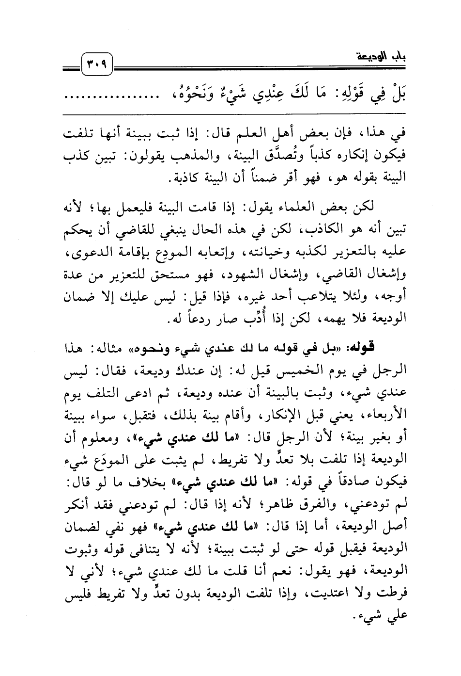 قوله: «بل في قوله ما لك عندي شيء ونحوه» مثاله: هذا الرجل في يوم الخميس قيل له: إن عندك وديعة، فقال: ليس عندي شيء، وثبت بالبينة أن عنده وديعة، ثم ادعى التلف يوم الأربعاء، يعني قبل الإنكار، وأقام بينة بذلك، فتقبل، سواء ببينة أو بغير بينة؛ لأن الرجل قال: «ما لك عندي شيء»، ومعلوم أن الوديعة إذا تلفت بلا تعدٍّ ولا تفريط، لم يثبت على المودَع شيء فيكون صادقاً في قوله: «ما لك عندي شيء» بخلاف ما لو قال: لم تودعني، والفرق ظاهر؛ لأنه إذا قال: لم تودعني فقد أنكر أصل الوديعة، أما إذا قال: «ما لك عندي شيء» فهو نفي لضمان الوديعة فيقبل قوله حتى لو ثبتت ببينة؛ لأنه لا يتنافى قوله وثبوت الوديعة، فهو يقول: نعم أنا قلت ما لك عندي شيء؛ لأني لا فرطت ولا اعتديت، وإذا تلفت الوديعة بدون تعدٍّ ولا تفريط فليس علي شيء.