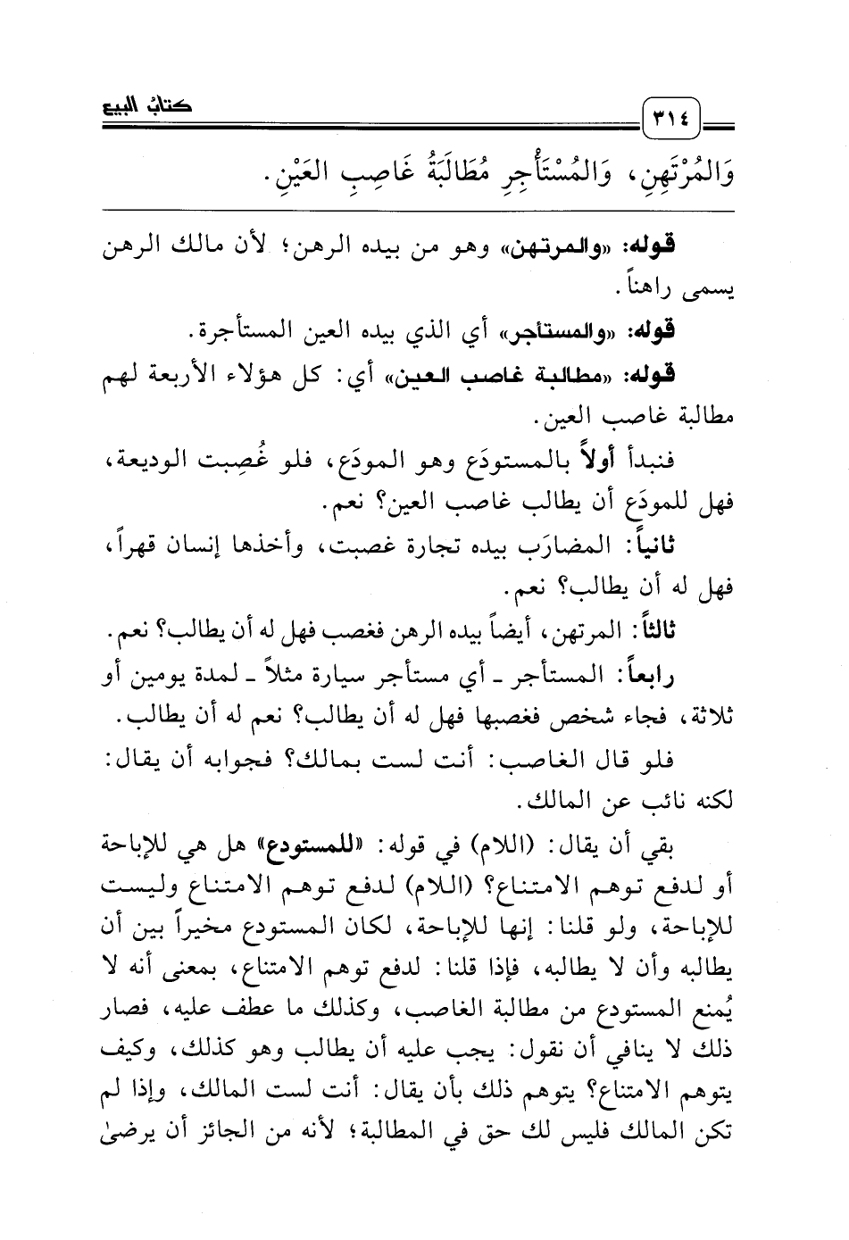 بقي أن يقال: (اللام) في قوله: «للمستودع» هل هي للإباحة أو لدفع توهم الامتناع؟ (اللام) لدفع توهم الامتناع وليست للإباحة، ولو قلنا: إنها للإباحة، لكان المستودع مخيراً بين أن يطالبه وأن لا يطالبه، فإذا قلنا: لدفع توهم الامتناع، بمعنى أنه لا يُمنع المستودع من مطالبة الغاصب، وكذلك ما عطف عليه، فصار ذلك لا ينافي أن نقول: يجب عليه أن يطالب وهو كذلك، وكيف يتوهم الامتناع؟ يتوهم ذلك بأن يقال: أنت لست المالك، وإذا لم تكن المالك فليس لك حق في المطالبة؛ لأنه من الجائز أن يرضى