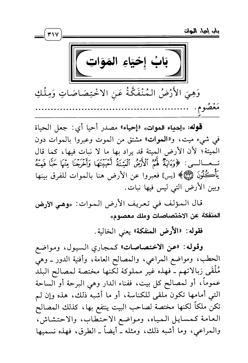 قوله: «إحياء الموات» «إحياء» مصدر أحيا أي: جعل الحياة في شيء ميت، و «الموات» مشتق من الموت وعبروا بالموات دون الميتة؛ لأن الأرض الميتة قد يراد بها ما لا نبات فيها، كما قال تعالى: {وَآيَةٌ لَهُمُ الأَرْضُ الْمَيْتَةُ أَحْيَيْنَاهَا وَأَخْرَجْنَا مِنْهَا حَبًّا فَمِنْهُ يَأْكُلُونَ *} [يس] فعبروا عن الأرض هنا بالموات للفرق بينها وبين الأرض التي ليس فيها نبات.
