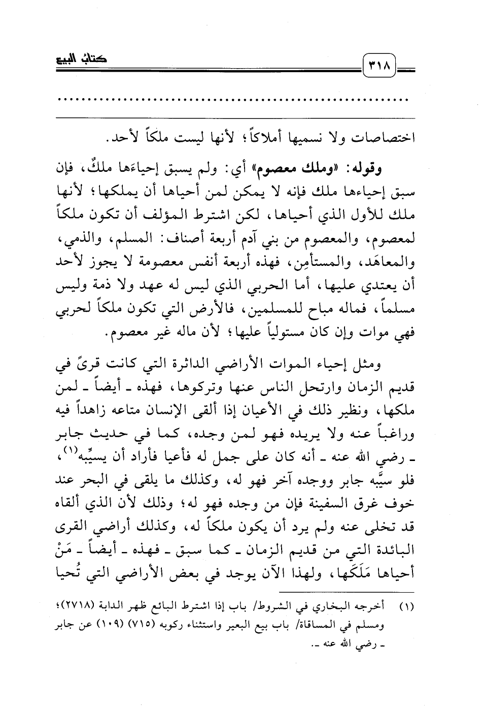 ومثل إحياء الموات الأراضي الداثرة التي كانت قرىً في قديم الزمان وارتحل الناس عنها وتركوها، فهذه ـ أيضاً ـ لمن ملكها، ونظير ذلك في الأعيان إذا ألقى الإنسان متاعه زاهداً فيه وراغباً عنه ولا يريده فهو لمن وجده، كما في حديث جابر ـ رضي الله عنه ـ أنه كان على جمل له فأعيا فأراد أن يسيِّبه (¬1)، فلو سيَّبه جابر ووجده آخر فهو له، وكذلك ما يلقى في البحر عند خوف غرق السفينة فإن من وجده فهو له؛ وذلك لأن الذي ألقاه قد تخلى عنه ولم يرد أن يكون ملكاً له، وكذلك أراضي القرى البائدة التي من قديم الزمان ـ كما سبق ـ فهذه ـ أيضاً ـ مَنْ أحياها مَلَكَها، ولهذا الآن يوجد في بعض الأراضي التي تُحيا