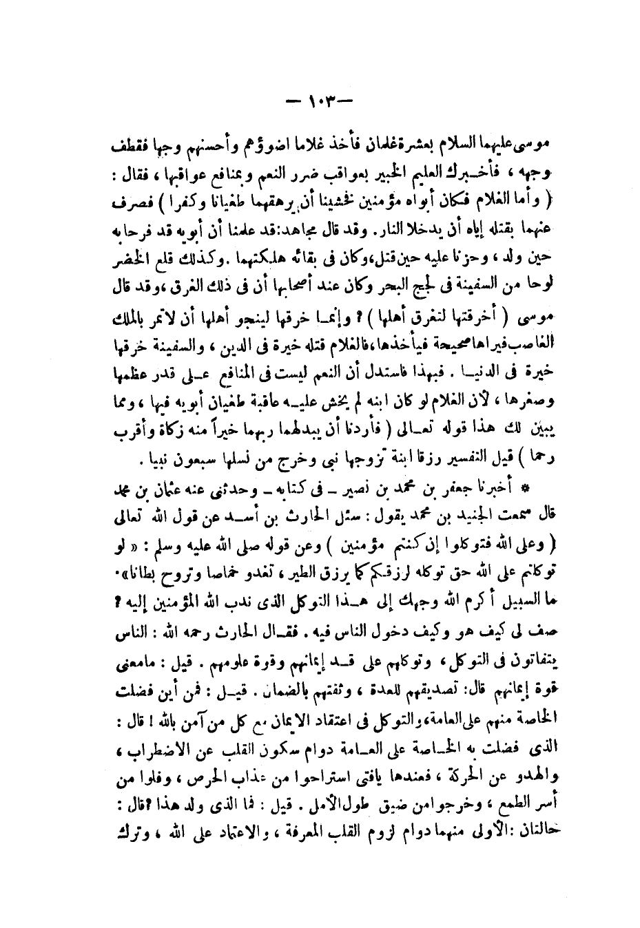 أَخْبَرَنَا جَعْفَرُ بْنُ مُحَمَّدِ بْنِ نُصَيْرٍ، فِي كِتَابِهِ , وَحَدَّثَنِي عَنْهُ عُثْمَانُ بْنُ مُحَمَّدٍ قَالَ: سَمِعْتُ الْجُنَيْدَ بْنَ مُحَمَّدٍ، يَقُولُ: سُئِلَ الْحَارِثُ بْنُ أَسَدٍ عَنْ قَوْلِ اللَّهِ تَعَالَى: {وَعَلَى اللَّهِ فَتَوَكَّلُوا إِنْ كُنْتُمْ مُؤْمِنِينَ} [المائدة: 23]، وَعَنْ قَوْلِهِ صَلَّى اللهُ عَلَيْهِ وَسَلَّمَ: «لَوْ تَوَكَّلْتُمْ عَلَى اللَّهِ حَقَّ تَوَكُّلِهِ لَرَزَقَكُمْ كَمَا يَرْزُقُ الطَّيْرَ تَغْدُو خِمَاصًا وَتَرُوحُ بِطَانًا»، مَا السَّبِيلُ أَكْرَمَ اللَّهُ وَجْهَكَ إِلَى هَذَا التَّوَكُّلِ الَّذِي نَدَبَ اللَّهُ الْمُؤْمِنِينَ إِلَيْهِ؟ صِفْ لِي كَيْفَ هُوَ؟ وَكَيْفَ دُخُولُ النَّاسِ فِيهِ؟ فَقَالَ الْحَارِثُ رَحِمَهُ اللَّهُ: " §النَّاسُ يَتَفَاوَتُونَ فِي التَّوَكُّلِ، وَتَوَكُّلُهُمْ عَلَى قَدْرِ إِيمَانِهِمْ وَقُوَّةِ عُلُومِهْمِ، قِيلَ: مَا مَعْنَى قُوَّةِ إِيمَانَهُمْ؟ قَالَ: تَصْدِيقُهُمْ لِلْعِدَةِ وَثِقَتُهُمْ بِالضَّمَانِ، قِيلَ: فَمِنْ أَيْنَ فُضِّلَتِ الْخَاصَّةُ مِنْهُمْ عَلَى الْعَامَّةِ وَالتَّوَكُّلُ فِي اعْتِقَادِ الْإِيمَانِ مَعَ كُلِّ مَنْ آمَنَ بِاللَّهِ؟ قَالَ: الَّذِي فُضِّلَتْ بِهِ الْخَاصَّةُ عَلَى الْعَامَّةِ دَوَامُ سُكُونِ الْقَلْبِ عَنِ الِاضْطِرَابِ وَالْهُدُوءُ عَنِ الْحَرَكَةِ فَعِنْدَهَا يَا فَتَى اسْتَرَاحُوا مِنْ عَذَابِ الْحِرْصِ وَفَلُّوا مِنْ أَسْرِ الطَّمَعِ وَخَرَجُوا مِنْ ضِيقِ طُولِ الْأَمَلِ، قِيلَ: فَمَا الَّذِي وَلَّدَ هَذَا؟ قَالَ: حالتانِ: الْأُولَى مِنْهُمَا دَوَامُ لُزُومِ الْقَلْبِ الْمَعْرِفَةَ وَالِاعْتِمَادَ عَلَى اللَّهِ وَتَرْكَ -[104]- الْحِيَلِ، وَالثَّانِيَةُ كَثْرَةُ الْمُمَارَسَةُ حَتَّى يَأْلَفَهَا إِلْفًا وَيَخْتَارَهَا اخْتِيَارًا، قِيلَ: فَالتَّوَكُّلُ فِي نَفْسِهِ مَا هُوَ؟ وَمَا مَعْنَاهُ؟ قَالَ: قَدِ اخْتَلَفَ النَّاسُ فِيهِ قِيلَ لَهُ: اخْتَصِرْ مِنْهُ جَوَابًا مُوجَزًا، قَالَ: نِعْمُ التَّوَكُّلُ هُوَ الِاعْتِمَادُ عَلَى اللَّهِ بِإِزَالَةِ الطَّمَعِ مِنْ سِوَى اللَّهِ، وَتَرْكُ تَدْبِيرِ النُّفُوسِ فِي الْأَغْذِيَةِ، وَالِاسْتِغْنَاءُ بِالْكِفَايَةِ، وَمُوَافَقَةُ الْقَلْبِ لِمُرَادِ الرَّبِّ، وَالْقُعُودُ فِي طَلَبِ الْعُبُودِيَّةِ، وَاللَّجْأُ إِلَى اللَّهِ، قِيلَ: فَهَلْ يَلْحَقُ التَّوَكُّلَ الْأَطْمَاعُ؟ قَالْ: تَلْحَقُهُ الْأَطْمَاعُ مِنْ طَرِيقِ الطِّبَاعِ خَطَرَاتٍ، وَلَا يَضُرُّهُ ذَلِكَ شَيْئًا، قِيلَ: فَمَا الَّذِي يُقَوِّيهِ عَلَى إِسْقَاطِ الطَّمَعِ؟ قَالَ: الْيَأْسَ مِمَّا فِي أَيْدِي النَّاسِ حَتَّى يَكُونَ بِمَا مَعَهُ مِنَ الثِّقَةِ بِمَا وَعْدَهُ سَيِّدُهُ أَغْنَى مِمَّنْ يَمْلِكُ الدُّنْيَا بِحَذَافِيرِهَا كَمَا قِيلَ لِأَبِي حَازِمٍ: أَلَكَ مَالٌ؟ قَالَ: أَكْثَرُ الْمَالِ ثِقَتِي بِرَبِّي وَيَأْسِي مِمَّا فِي أَيْدِي النَّاسِ، وَكَانَ أَبُو حَازِمٍ يَقُولُ: الدُّنْيَا شَيْئَانِ شَيْءٌ لِي وَشَيْءٌ لِغَيْرِي فَمَا كَانَ لِي لَوْ طَلَبْتُهُ بِحِيلَةٍ مِنَ السَّمَاوَاتِ وَالْأَرْضِ لَمْ يَأْتِنِي قَبْلَ أَجَلِهِ، وَمَا كَانَ لِغَيْرِي لَمْ أَرْجُهُ فِيمَا مَضَى وَلَا أَرْجُوهُ فِيمَا بَقِيَ يُمْنَعُ رِزْقِي مِنْ غَيْرِي كَمَا يُمْنَعُ رِزْقُ غَيْرِي مِنِّي فَفِي أَيِّ هَذَيْنِ أُفْنِي عُمْرِي؟ وَكَانَ بَعْضُهُمْ يَقُولُ: