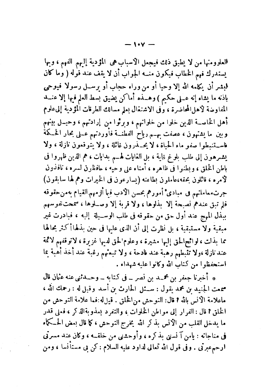 أَخْبَرَنَا جَعْفَرُ بْنُ مُحَمَّدِ بْنِ نُصَيْرٍ، فِي كِتَابِهِ , وَحَدَّثَنِي عَنْهُ عُثْمَانُ قَالَ: سَمِعْتُ الْجُنَيْدَ بْنَ مُحَمَّدٍ، يَقُولُ: سُئِلَ الْحَارِثُ بْنُ أَسَدٍ وَقِيلَ لَهُ: رَحِمَكَ اللَّهُ مَا عَلَامَةُ الْأُنْسِ بِاللَّهِ؟ قَالَ: " §التَّوَحُّشُ مِنَ الْخَلْقِ، قِيلَ لَهُ: فَمَا عَلَامَةُ التَّوَحُّشِ مِنَ الْخَلْقِ؟ قَالَ: الْفِرَارُ إِلَى مَوَاطِنِ الْخَلَوَاتِ وَالتَّفَرُّدُ بِعُذُوبَةِ الذِّكْرِ فَعَلَى قَدْرِ مَا يَدْخُلُ الْقَلْبَ مِنَ الْأُنْسِ بِذِكْرِ اللَّهِ يَخْرُجُ التَّوَحُّشُ كَمَا قَالَ بَعْضُ الْحُكَمَاءِ فِي مُنَاجَاتِهِ: يَا مَنْ آنَسَنِي بِذِكْرِهِ وَأَوْحَشَنِي مِنْ خَلْقِهِ، وَكَانَ عِنْدَ مَسَرَّتِي ارْحَمْ عَبْرَتِي، وَفِي قَوْلِ اللَّهِ تَعَالَى لِدَاودَ عَلَيْهِ السَّلَامُ: كُنْ بِي مُسْتَأْنِسًا وَمِنْ -[108]- سِوَايَ مُسْتَوْحِشًا ". وَقِيلَ لِبَعْضِ الْمُتَعَبِّدِينَ: مَا فَعَلَ فُلَانٌ؟ قَالَ: أَنِسَ فَتَوَحَّشَ، وَقِيلَ لِرَابِعَةَ: بِمَ نِلْتِ هَذِهِ الْمَنْزِلَةَ؟ قَالَتْ: بِتَرْكِي مَا لَا يَعْنِينِي وَأُنْسِي بِمَنْ لَمْ يَزَلْ يُوَالِنِي، وَقَالَ ذُو النُّونِ فِي بَعْضِ كَلَامِهِ: يَا أَنِيسَ كُلِّ مُنْفَرِدٍ بِذِكْرِكَ، وَجَلِيسَ كُلِّ مُتَوَحِّدٍ بِحُبِّكَ، وَقَالَ عَبْدُ الْوَاحِدِ بْنُ زَيْدٍ لرَاهِبٍ: يَا رَاهِبُ لَقَدْ تَعَجَّلْتَ الْوَحْدَةَ، فَقَالَ الرَّاهِبُ: يَا فَتَى لَوْ ذُقْتَ حَلَاوَةَ الْوَحْدَةِ لَاسْتَوْحَشْتَ إِلَيْهَا مِنْ نَفْسِكِ، الْوَحْدَةُ رَأْسُ الْعِبَادَةِ مَا آنَسَتْهَا الْفِكْرَةَ، قَالَ: يَا رَاهِبُ، مَا أَقَلُّ مَا يَجِدُ الْعَبْدُ فِي الْوَحْدَةِ؟ قَالَ: الرَّاحَةُ مِنْ مُدَارَاةِ النَّاسِ وَالسَّلَامَةُ مِنْ شَرِّهِمْ , قَالَ: يَا رَاهِبُ، مَتَى يَذُوقُ الْعَبْدُ حَلَاوَةَ الْأُنْسِ بِاللَّهِ؟ قَالَ: إِذَا صَفَا الْوُدُّ وَخَلُصَتِ الْمُعَامَلَةُ، قَالَ: يَا عَبْدَ اللَّهِ مَتَى يَصْفُو الْوُدُّ؟ قَالَ: إِذَا اجْتَمَعَ الْهَمُّ فَصَارَ فِي الطَّاعَةِ، قُلْتُ: مَتَى تَخْلُصُ الْمُعَامَلَةُ؟ قَالَ: إِذَا اجْتَمَعَ الْهَمُّ فَصَارَ هَمًّا وَاحِدًا، وَقَالَ بَعْضُ الْحُكَمَاءِ: عَجَبًا لِلْخَلَائِقِ كَيْفَ أَرَادُوا بِكَ بَدَلًا؟ وَعَجَبًا لِلْقُلُوبِ كَيْفَ اسْتَأْنَسَتِ بِسِوَاكَ عَنْكَ؟ اللَّهُمَّ آنَسْتَ الْآنِسِينَ مِنْ أَوْلِيَائِكِ وَخَصَصْتَهُمْ بِكِفَايَةِ الْمُتَوَكِّلِينَ عَلَيْكَ تُشَاهِدُهُمْ فِي ضَمَائِرِهِمْ وَتَطَّلِعُ عَلَيْهِمْ فِي سَرَائِرِهِمْ وَسِتْرِي عِنْدَكَ مَكْشُوفٌ وَأَنَا إِلَيْكَ مَلْهُوفٌ فَإِذَا أَوْحَشَتْنِي الْعُزْلَةُ آنَسَنِي ذِكْرُكَ وَإِذَا كَثُرَتْ عَلَيَّ الْهُمُومُ رَجَعْتُ إِلَى الِاسْتِجَارَةِ بِكَ يَا رَبَّ الْعَالَمِينَ، وَقَالَ إِبْرَاهِيمُ بْنُ أَدْهَمَ: جِئْتُ مِنْ أُنْسِ الرَّحْمَنِ، وَكَمَا قَالَ بَعْضُ الْحُكَمَاءِ: لَوْ أَنَّ مَعِي أُنْسًا لَتَوَحَّشْتُ، قِيلَ: رَحِمَكَ اللَّهُ فَمَا عَلَامَةُ صِحَّةِ الْأُنْسِ بِاللَّهِ؟ قَالَ: ضِيقُ الصَّدْرِ مِنْ مُعَاشَرَةِ الْخَلْقِ وَالتَّبَرُّمُ بِهِمْ وَاخْتِيَارُ الْقَلْبِ عُذُوبَةَ الذِّكْرِ , قِيلَ: رَحِمَكَ اللَّهُ فَمَا عَلَامَتُهُ فِي ظَاهِرِهِ؟ قَالَ: مُنْفَرِدٌ فِي جَمَاعَةٍ وَمُسْتَجْمِعٌ فِي خَلْوَةٍ وَغَرِيبٌ فِي حَضَرٍ وَحَاضِرٌ فِي سَفَرٍ وَشَاهِدٌ فِي غَيْبَةٍ وَغَائِبٌ فِي حُضُورٍ، قِيلَ: اشْرَحْ عَنْ وَصْفِ هَذَا مَا مَعْنَى مُنْفَرِدٍ فِي جَمَاعَةٍ وَمُسْتَجْمِعٍ فِي خَلْوَةٍ؟ قَالَ: مُنْفَرِدٌ بِالذِّكْرِ مَشْغُولٌ بِالْفِكْرِ لِمَا اسْتَوْلَى عَلَى الْقَلْبِ وَالْهَمِّ مِنَ الشُّغْلِ وَطِيبِ عُذُوبَةِ الذِّكْرِ وَحَلَاوَتِهِ وَهُوَ مُنْفَرِدٌ فِيمَا هُوَ