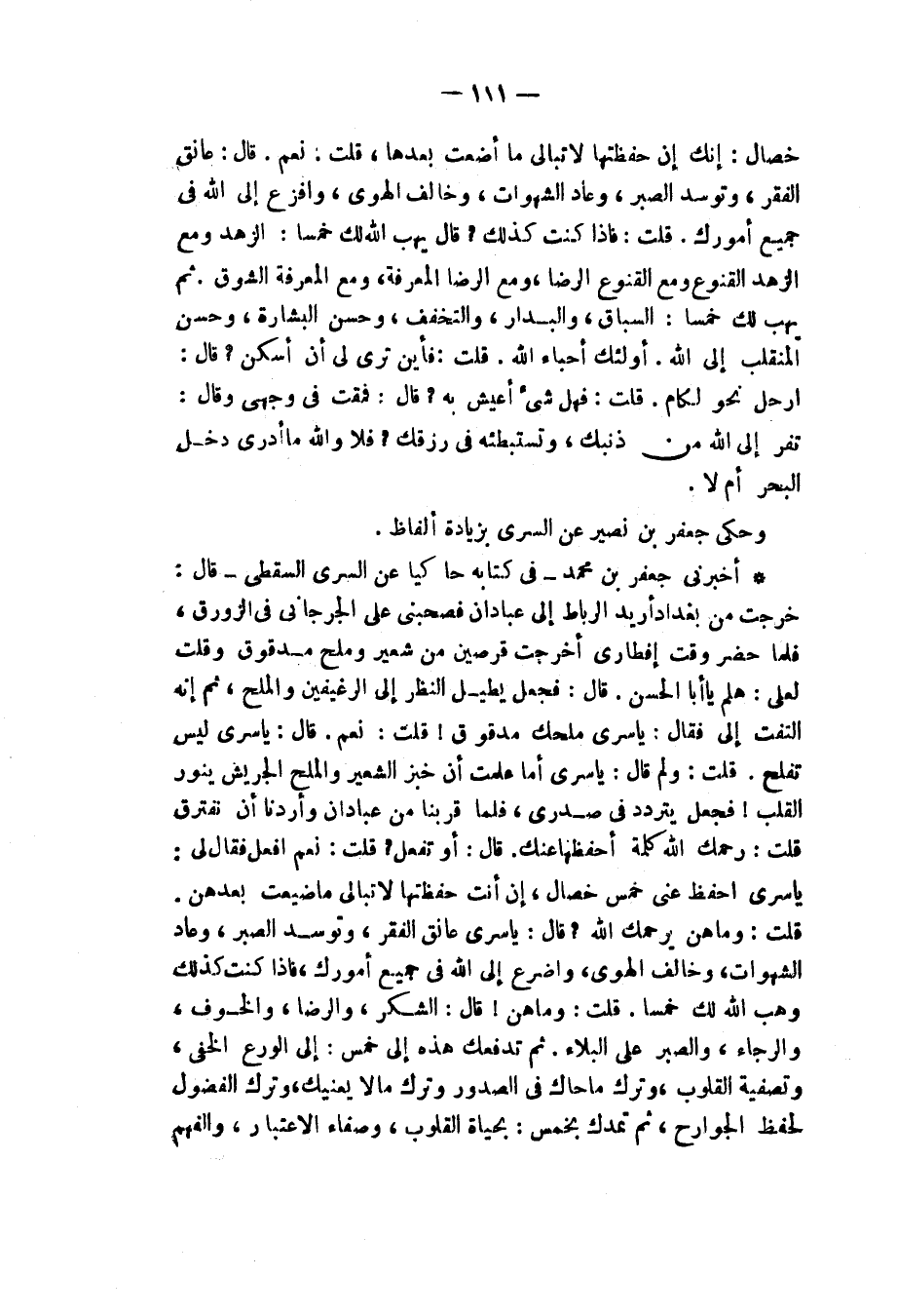 أَخْبَرَنِي جَعْفَرُ بْنُ مُحَمَّدٍ، فِي كِتَابِهِ حَاكِيًا , عَنِ السَّرِيِّ السَّقَطِيِّ قَالَ: خَرَجْتُ مِنْ بَغْدَادَ أُرِيدُ الرِّبَاطَ إِلَى عَبَّادَانَ فَصَحِبَنِي عَلِيٌّ الْجُرْجَانِيُّ فِي الزَّوْرَقِ فَلَمَّا حَضَرَ وَقْتُ إِفْطَارِي أَخْرَجْتُ قُرْصَيْنِ مِنْ شَعِيرٍ وَمِلْحًا مَدْقُوقًا وَقُلْتُ لِعَلِيٍّ: هَلُمَّ يَا أَبَا الْحَسَنِ، قَالَ: فَجَعَلَ يُطِيلُ النَّظَرَ إِلَى الرَّغِيفَيْنِ وَالْمِلْحِ ثُمَّ إِنَّهُ الْتَفَتَ إِلَيَّ فَقَالَ: يَا سَرِيُّ مِلْحُكَ مَدْقُوقٌ؟ قُلْتُ: نَعَمْ، قَالَ: يَا سَرِيُّ، لَيْسَ تُفْلِحُ، قُلْتُ: وَلِمَ؟ قَالَ: يَا سَرِيُّ أَمَا عَلِمْتَ أَنَّ خُبْزَ الشَّعِيرِ وَالْمِلْحَ الْجَرِيشَ يُنَوِّرُ الْقَلْبَ، فَجَعَلَ يَتَرَدَّدُ فِي صَدْرِي فَلَمَّا قَرُبْنَا مِنْ عَبَّادَانَ وَأَرَدْنَا أَنْ نَفْتَرِقَ قُلْتُ: رَحِمَكَ اللَّهُ، كَلِمَةً أَحْفَظُهَا عَنْكَ، قَالَ: أَوَ تَفْعَلُ؟ قُلْتُ: نَعَمْ أَفْعَلُ فَقَالَ لِي: يَا سَرِيُّ احْفَظْ عَنِّي خَمْسَ خِصَالٍ إِنْ أَنْتَ حَفِظْتَهَا لَا تُبَالِي مَا ضَيَّعْتَ بَعْدَهُنَّ، قُلْتُ: وَمَا هُنَّ يَرْحَمُكَ اللَّهُ؟ قَالَ: " يَا سَرِيُّ §عَانَقِ الْفَقْرَ وَتَوَسَّدِ الصَّبْرَ وَعَادِ الشَّهَوَاتِ وَخَالِفِ الْهَوَى وَاضْرَعْ إِلَى اللَّهِ فِي جَمِيعِ أُمُورِكَ فَإِذَا كُنْتَ كَذَاكَ وَهَبَ اللَّهُ لَكَ خَمْسًا، قُلْتُ: وَمَا هُنَّ؟ قَالَ: الشُّكْرُ وَالرِّضَا وَالْخَوْفُ وَالرَّجَاءُ وَالصَّبْرُ عَلَى الْبَلَاءِ، ثُمَّ تَدْفَعُكَ هَذِهِ إِلَى خَمْسٍ إِلَى الْوَرَعِ الْخَفِيِّ وَتَصْفِيَةِ الْقُلُوبِ وَتَرْكِ مَا حَاكَ فِي الصُّدُورِ وَتَرْكِ مَا لَا يَعْنِيكَ وَتَرْكِ الْفُضُولِ لِحِفْظِ الْجَوَارِحِ ثُمَّ تَمُدُّكَ بِخَمْسٍ: بِحَيَاةِ الْقُلُوبِ وَصَفَاءِ الِاعْتِبَارِ وَالْفَهْمِ -[112]- عَنِ اللَّهِ، وَالتَيَقُّظِ مِنَ الْغَفْلَةِ وَمُسَاعَدَةِ الْأَوْطَانِ فِي طَاعَةِ اللَّهِ، فَعِنْدَهَا يُرِيدُكَ اللَّهُ بِخَمْسَةِ أَرْدِيَةٍ: اللُّطْفُ وَالْحِلْمُ وَالرَّأْفَةُ وَالرَّحْمَةُ لِلْعَالِمِ وَهَيْبَةُ النَّارِ، إِذَا اطَّلَعْتَ عَلَيْهَا ذَكَرْتَ اللَّهَ بِالرُّبُوبِيَّةِ، وَيَلْزَمُ قَلْبُكَ خَمْسًا: السِّبَاقَ وَالْبِدَارَ وَالتَّصَبُّرَ عَنِ الْحَرَامِ وَصِدْقَ الِانْقِطَاعِ وَصِحَّةَ الْإِرَادَةِ "