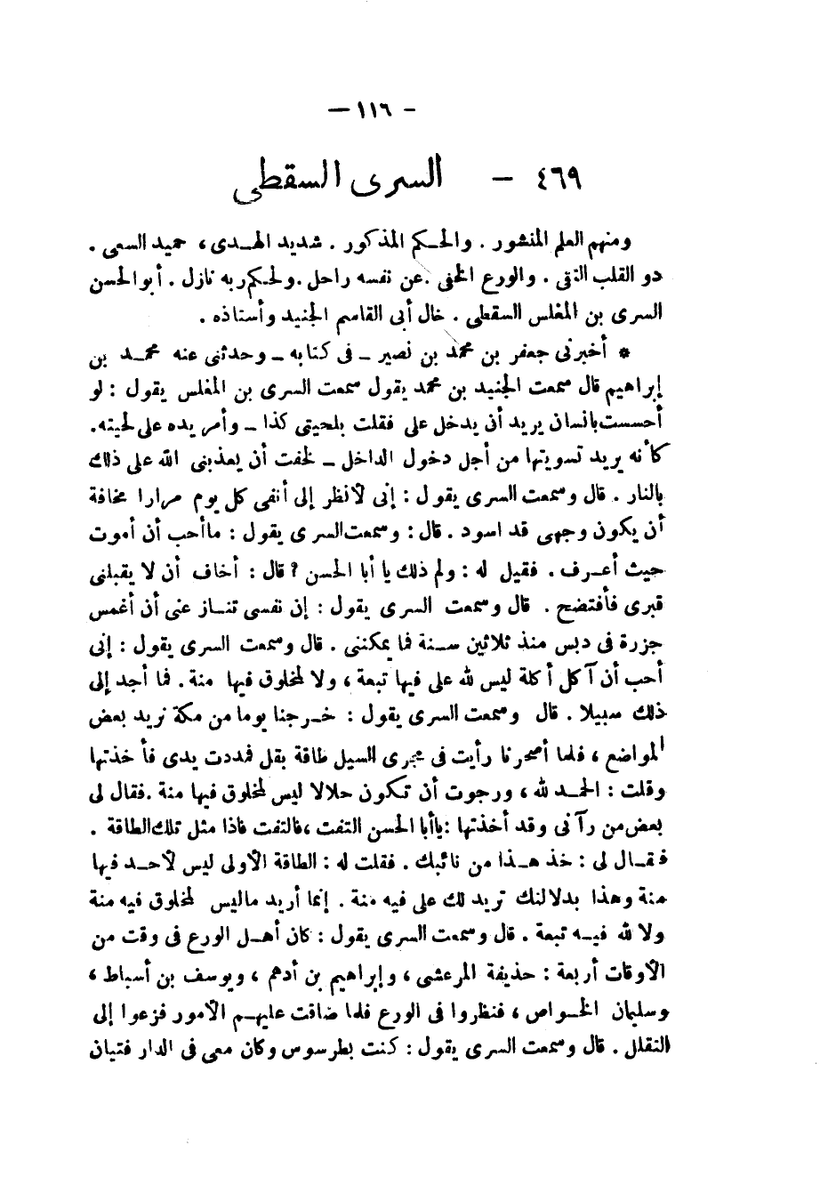 أَخْبَرَنِي جَعْفَرُ بْنُ مُحَمَّدِ بْنِ نُصَيْرٍ، فِي كِتَابِهِ وَحَدَّثَنِي عَنْهُ مُحَمَّدُ بْنُ إِبْرَاهِيمَ قَالَ: سَمِعْتُ الْجُنَيْدَ بْنَ مُحَمَّدٍ، يَقُولُ: سَمِعْتُ السَّرِيَّ بْنَ الْمُغَلِّسِ، يَقُولُ: " §لَوْ أَحْسَسْتُ بِإِنْسَانٍ يُرِيدُ أَنْ يَدْخُلَ عَلَيَّ فَقُلْتُ بِلِحْيَتِي كَذَا وَأَمَرَّ يَدَهُ عَلَى لِحْيَتِهِ، كَأَنَّهُ يُرِيدُ تَسْوِيَتَهَا مِنْ أَجْلِ دُخُولِ الدَّاخِلِ لَخِفْتُ أَنْ يُعَذِّبَنِيَ اللَّهُ عَلَى ذَلِكَ بِالنَّارِ، قَالَ: وَسَمِعْتُ السَّرِيَّ، يَقُولُ: إِنِّي لَأَنْظُرُ إِلَى أَنْفِي كُلَّ يَوْمٍ مِرَارًا مَخَافَةَ أَنْ يَكُونَ وَجْهِي قَدِ اسْوَدَّ، قَالَ: وَسَمِعْتُ السَّرِيَّ، يَقُولُ: مَا أُحِبُّ أَنْ أَمُوتَ حَيْثُ أَعْرِفُ فَقِيلَ لَهُ: وَلِمَ ذَلِكَ يَا أَبَا الْحَسَنِ؟ قَالَ: أَخَافُ أَنْ لَا يَقْبَلَنِي قَبْرِي فَأَفْتَضِحَ، قَالَ: وَسَمِعْتُ السَّرِيَّ، يَقُولُ: إِنَّ نَفْسِي تُنَازِعُنِي أَنِ اغْمِسَ جَزْرَةً فِي دِبْسٍ مُنْذُ ثَلَاثِينَ سَنَةً فَمَا يُمْكِنُنِي، قَالَ: وَسَمِعْتُ السَّرِيَّ، يَقُولُ: إِنِّي أُحِبُّ أَنْ آكُلَ أُكْلَةً لَيْسَ لِلَّهِ عَلَيَّ فِيهَا تَبِعَةٌ وَلَا لِمَخْلُوقٍ فِيهَا مِنَّةٌ، فَمَا أَجِدُ إِلَى ذَلِكَ سَبِيلًا، قَالَ: وَسَمِعْتُ السَّرِيَّ، يَقُولُ: خَرَجْنَا يَوْمًا مِنْ مَكَّةَ نُرِيدُ بَعْضَ الْمَوَاضِعِ فَلَمَّا أَصْحَرْنَا رَأَيْتُ فِيَ مَجْرَى السَّيْلِ طَاقَةَ بَقْلٍ فَمَدَدْتُ يَدِي فَأَخَذْتُهَا وَقُلْتُ: الْحَمْدُ لِلَّهِ وَرَجَوْتُ أَنْ تَكُونَ حَلَالًا لَيْسَ لِمَخْلُوقٍ فِيهَا مِنَّةٌ فَقَالَ لِي بَعْضُ مَنْ رَآنِي وَقَدْ أَخَذْتُهَا: يَا أَبَا الْحَسَنِ، فَالْتَفَتَ فَإِذَا مِثْلُ تِلْكَ الطَّاقَةِ فَقَالَ لِي: خُذْ هَذَا مِنْ نَائِبِكَ، فَقُلْتُ لَهُ: الطَّاقَةُ الْأُولَى لَيْسَ لِأَحَدٍ فِيهَا مِنَّةٌ وَهَذَا بَدَلًا لَعَلَّكَ تُرِيدُ لَكَ عَلَيَّ فِيهِ مِنَّةً، إِنَّمَا أُرِيدُ مَا لَيْسَ لِمَخْلُوقٍ فِيهِ مِنَّةٌ، وَلَا لِلَّهِ فِيهِ تَبِعَةٌ قَالَ: وَسَمِعْتُ السَّرِيَّ، يَقُولُ: كَانَ أَهْلُ الْوَرَعِ فِي وَقْتٍ مِنَ الْأَوْقَاتِ أَرْبَعَةً: حُذَيْفَةُ الْمَرْعَشِيُّ، وَإِبْرَاهِيمُ بْنُ أَدْهَمَ، وَيُوسُفُ بْنُ أَسْبَاطٍ، وَسُلَيْمَانُ الْخَوَّاصُ فَنَظَرُوا فِي الْوَرَعِ فَلَمَّا ضَاقَتْ عَلَيْهِمِ الْأُمُورُ فَزِعُوا إِلَى التَّقَلُّلِ، قَالَ: وَسَمِعْتُ السَّرِيَّ، يَقُولُ: كُنْتُ بِطَرَسُوسَ وَكَانَ مَعِي فِي الدَّارِ فَتَيَانُ -[117]- مُتَعَبِّدُونَ وَكَانَ فِي الدَّارِ تَنُّورٌ يَخْبِزُونَ فِيهِ فَانْكَسَرَ التَّنُّورُ فَعَمِلْتُ لَهُمْ بَدَلَهُ مِنْ مَالِي فَتَوَرَّعُوا أَنْ يَخْتَبِزُوا فِيهِ، قَالَ: وَسَمِعْتُ السَّرِيَّ وَذَكَرَ أَنَّ أَبَا يُوسُفَ الْغَسُولِيَّ، كَانَ يَلْزَمُ الثَّغْرَ وَيَغْزُو وَكَانَ إِذَا غَزَا وَدَخَلُوا بِلَادَ الرُّومِ أَكَلَ أَصْحَابُهُ مِنْ طَعَامِ الرُّومِ وَفَوَاكِهِهِمْ فَيَقُولُ أَبُو يُوسُفَ: لَا آكُلُ فَيقَالُ لَهُ: تَشُكُّ أَنَّهُ حَلَالٌ فَيَقُولُ: لَا أَشُكُّ هُوَ حَلَالٌ، فَيقَالُ لَهُ: فَكُلْ مِنَ الْحَلَالِ، فَيَقُولُ: إِنَّمَا الزُّهْدُ فِي الْحَلَالِ، قَالَ: وَسَمِعْتُ السَّرِيَّ، يَذُمُّ مَنْ يَأْكُلُ بِدِينِهِ وَيَقُولُ: مِنَ النَّذَالَةِ أَنْ يَأْكُلَ الْعَبْدُ بِدِينِهِ "